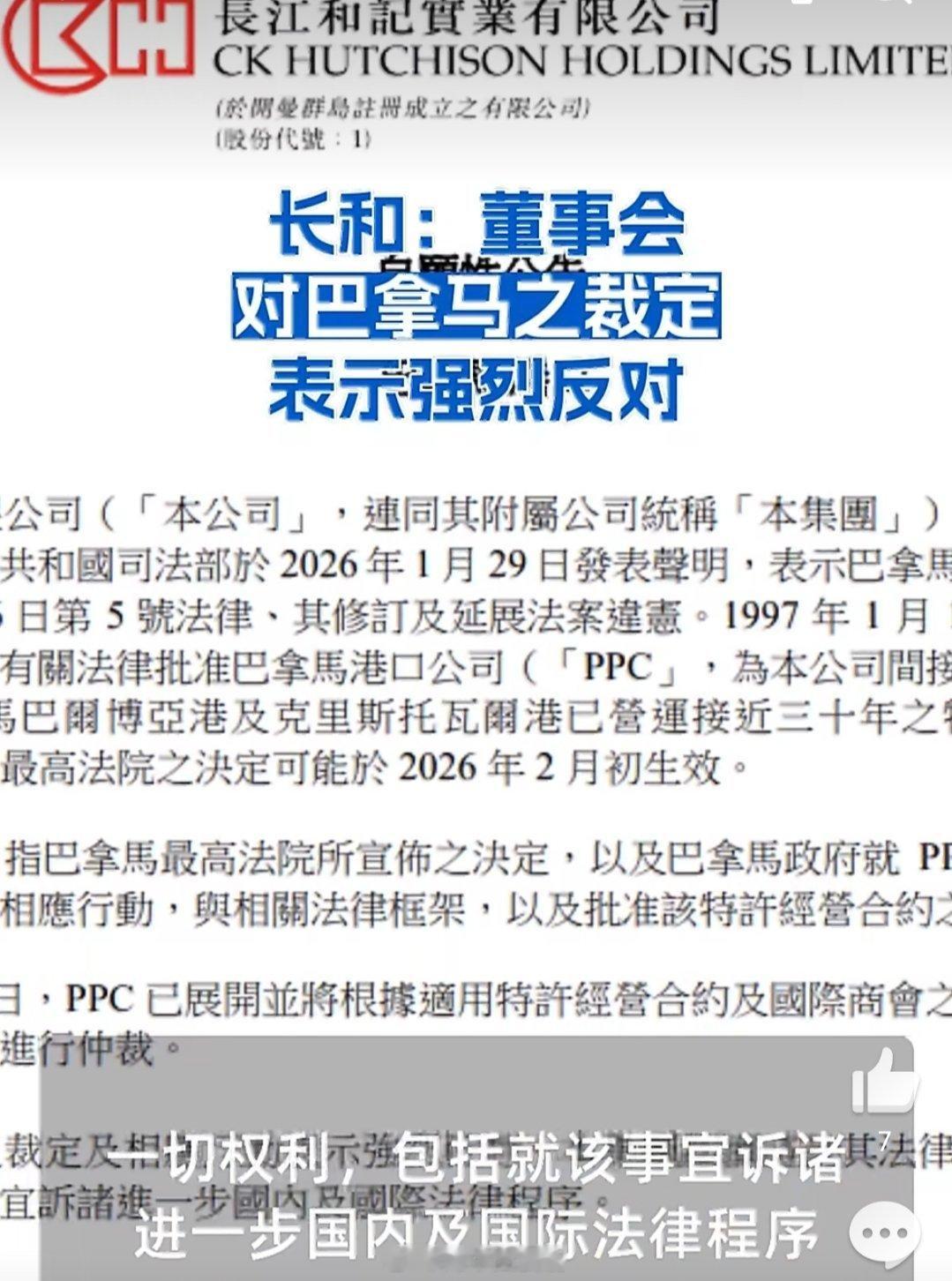 长和董事会强烈反对巴拿马裁定长和董事会反对巴拿马裁定,本质是对契约精神和法治原则的捍卫。PPC近三十年合规运营两大港口,续约流程经巴拿马官方层层批准,如今被以“程序瑕疵”单方否定,毫无法律依据。巴拿马此举不仅损害长和合法权益,更打破国际投资的信任基础,让全球投资者对拉美营商环境心生警惕。国际仲裁是正当维权,唯有坚守合约,才能维护跨国经贸的基本秩序。