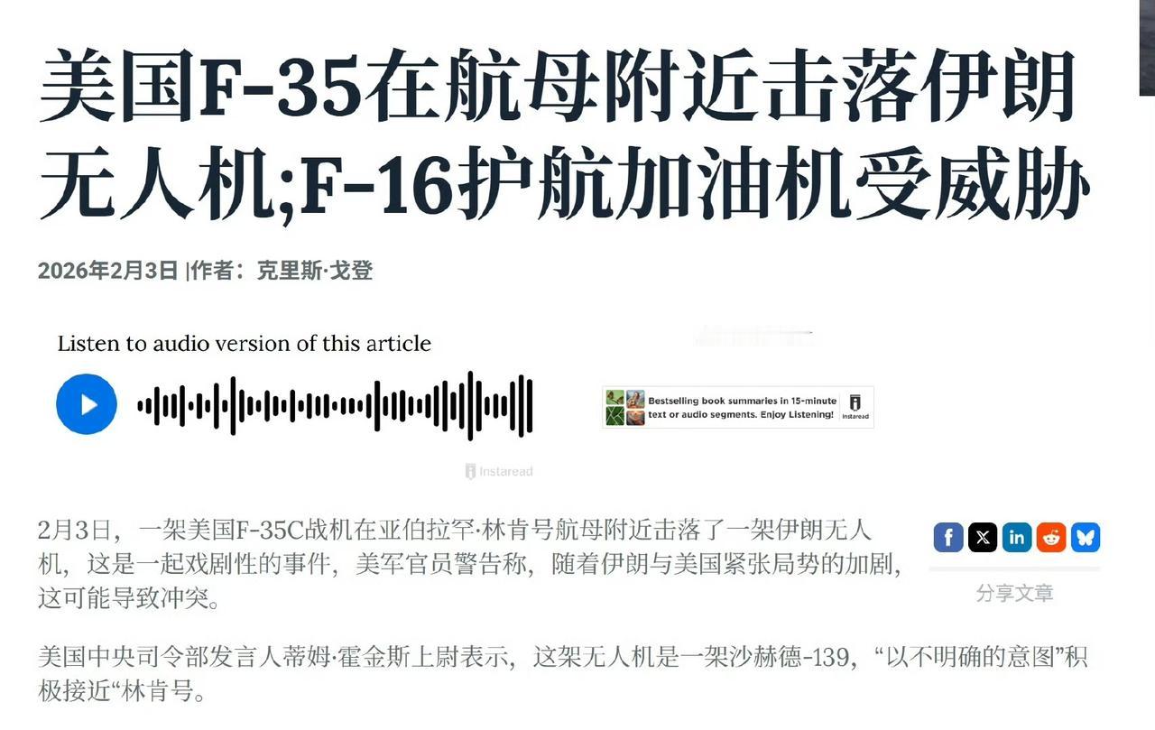 突发!打了,打了!美军F-35C舰载机击落伊朗来袭军机 2月3日夜间,阿拉伯海上演了一出"猫捉老鼠"的戏码——美国林肯号航母的F-35C舰载机,击落了一架伊朗沙赫德-129大型无人机。 事发时林肯号航母正在阿拉伯海航行,距离伊朗南部海岸约805公里,这架伊朗沙赫德-129无人机以“意图不明”的方式持续接近航母,美军先采取了所谓“缓和局势”的措施,但无人机并未改变航向,最终林肯号上起飞的F-35C隐形舰载机出手,将其击落,整个过程中没有美军人员受伤,也没有美方装备受损,白宫随后表态,称这次击落行动“适当”,是合理的自卫行为。 而伊朗方面的回应则截然不同,没有直接抗议或谴责,反而用了“失联”来定性。伊方一名消息人士透露,这架无人机当天正在公海执行常规合法的侦察、监视和拍照任务,并且已经成功将拍摄的图片传回指挥中心,之后才突然失联。 可能有人会问,一款无人机而已,美军至于动用F-35C这种隐形战机出手吗?其实这背后离不开两款装备的定位差异,也藏着美军的小心思。 就说F-35C,作为美军舰载机里的“王牌选手”,它是F-35系列中专门为航母设计的弹射起降型号,体型比其他两款更大,机翼面积增加35%,作战半径能达到1100千米左右,隐身性能更是顶尖,既能执行空战任务,也能搜集战场情报、引导其他装备作战。 美军目前在航母上采用“混搭”部署模式,F-35C搭配其他战机形成战力,这次用它拦截无人机,一方面是因为其反应速度快、隐身性好,能快速应对近距离威胁,另一方面也是在借机展示这款隐形战机的实战部署能力,毕竟它列装时间晚、形成战力慢,美军急需通过实战化场景证明其价值。 再看伊朗的沙赫德-129无人机,这款无人机是伊朗的主力侦察机型,虽然没有隐身能力,但续航时间长、侦察范围广,能在公海完成长时间的监视任务,是伊朗监控波斯湾、阿拉伯海海域美军动向的重要装备。 伊朗一直重视无人机发展,就是为了在海上对抗中弥补与美军的装备差距,通过常态化的侦察部署,掌握美军航母、舰艇的活动轨迹,这次派无人机接近林肯号,大概率是常规的侦察行动,而非主动挑衅,毕竟伊朗也清楚,正面挑衅美军航母得不偿失。 这次无人机被击落事件,并不是孤立的摩擦,几小时后就发生了后续风波——两艘伊朗伊斯兰革命卫队船只和另一架无人机,在霍尔木兹海峡高速接近一艘美国油轮,还威胁要登船扣押,好在美军“麦克福尔”号导弹驱逐舰及时赶赴现场,在美国空军支援下护送油轮脱离危险,局势才得以缓和。 这两起事件接连发生,看似剑拔弩张,但背后都透着美伊双方的克制,美军击落无人机后没有进一步行动,伊朗对无人机失联的回应也留有余地,没有升级言辞对抗,核心原因就是双方正在筹备新一轮核谈判。 事发当天,美伊双方都确认了谈判的相关进展:特朗普表示,美伊本周的谈判仍在继续,伊朗有意愿采取行动,只是不便透露谈判地点;伊朗外交部发言人也透露,谈判计划已制定,未来几天将举行,土耳其、阿曼等国愿意主办会谈,双方高级官员预计6日在伊斯坦布尔会面,讨论核协议相关问题。 这是2025年6月美军空袭伊朗核设施后,双方首次举行高级别面对面会谈,无论是美军还是伊朗,都不想因为一次无人机事件破坏谈判氛围,毕竟核问题关乎双方核心利益,美军需要通过谈判遏制伊朗核发展,伊朗则希望通过谈判解除制裁、改善处境。 所以说到底,这次F-35C击落伊朗无人机,本质上是美伊“边谈边博弈”的体现——双方都在通过军事动作展示实力,为谈判争取筹码,同时又刻意控制局势,避免彻底撕破脸。 美军的拦截是在维护其海上主导地位,警告伊朗不要过度接近其舰艇;伊朗的侦察和后续接近油轮的行动,是在表明自己不会屈服于美军的海上施压,会坚守自身在海域的活动权利。 这种“斗而不破”的状态,正是美伊关系的常态,尤其是在波斯湾、阿拉伯海这片战略要地,双方的角力从来没有停止过。 后续来看,美伊核谈判的进展会直接影响双方的海上互动,只要谈判能顺利推进,类似的摩擦大概率会减少;但如果谈判陷入僵局,美军可能会进一步加强在中东的军事部署,伊朗也会加大无人机侦察力度,双方的海上对峙或许会升级。 不过从目前的态势来看,双方都有谈判的意愿,都在尽量避免局势失控,毕竟战争对双方都没有好处,尤其是在全球经济复苏乏力、地区局势复杂的背景下,通过外交谈判解决分歧,才是双方最稳妥的选择。 新锐创作者成长计划