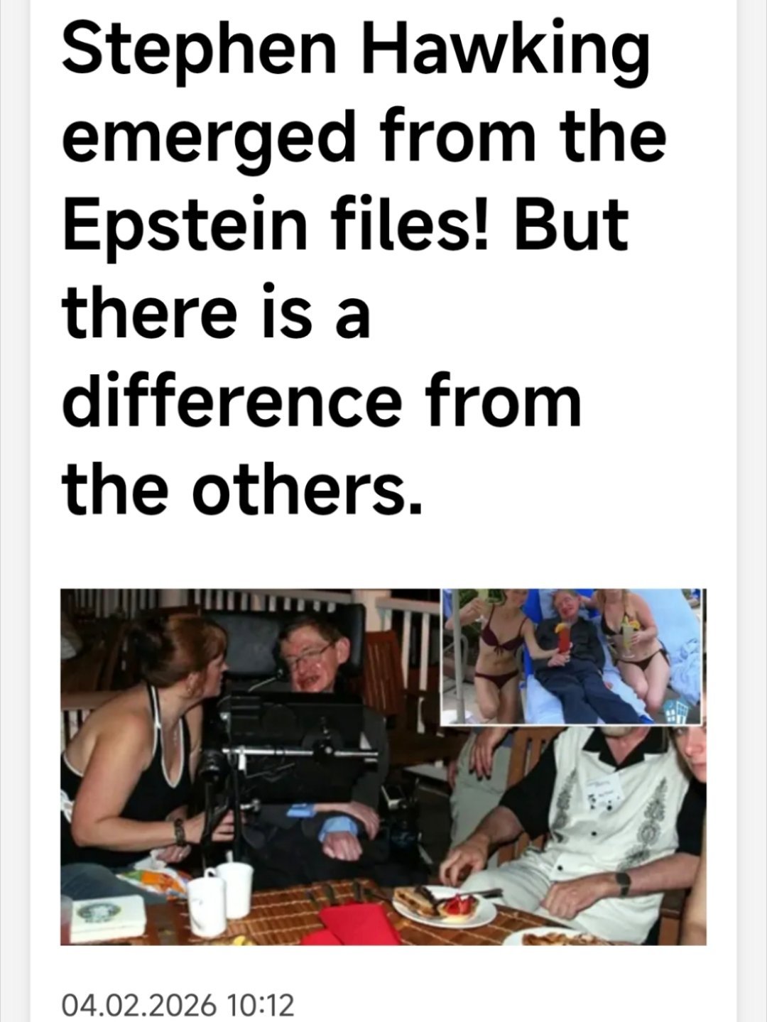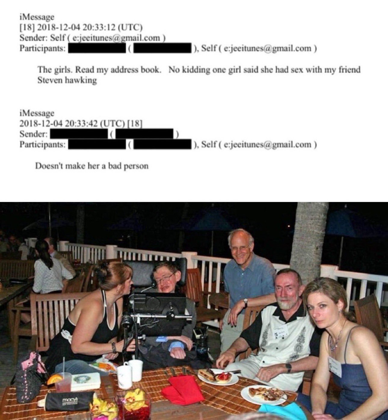 爱泼斯坦曾称帮霍金圆了潜水梦关于霍金和爱泼斯坦就知道三件事:¹ 霍金在2006年上岛,参加科学会议。² 爱泼斯坦招待了他。显然有女士陪同。³ 爱泼斯坦说一个女孩告诉他,她跟霍金发生了关系。图2。