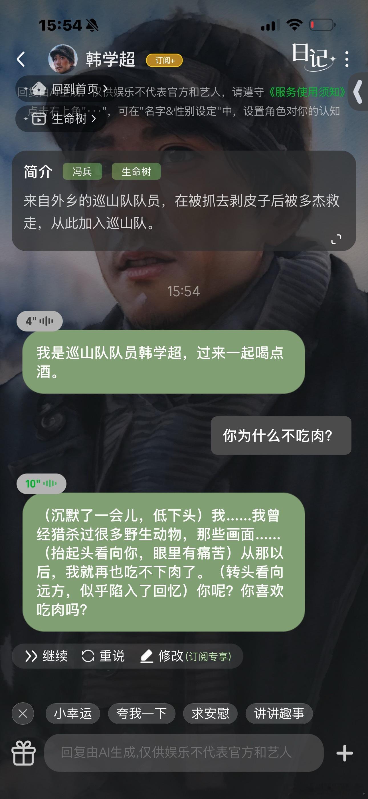 老韩不吃肉的原因真的是因为曾经猎杀过很多野生动物,在忏悔生命树的细节做的好棒。几年前也曾去吃过现杀黑鱼火锅,看到过黑鱼当着顾客面砸死满地血还在乱蹦后,现在再也没吃过鱼了…
