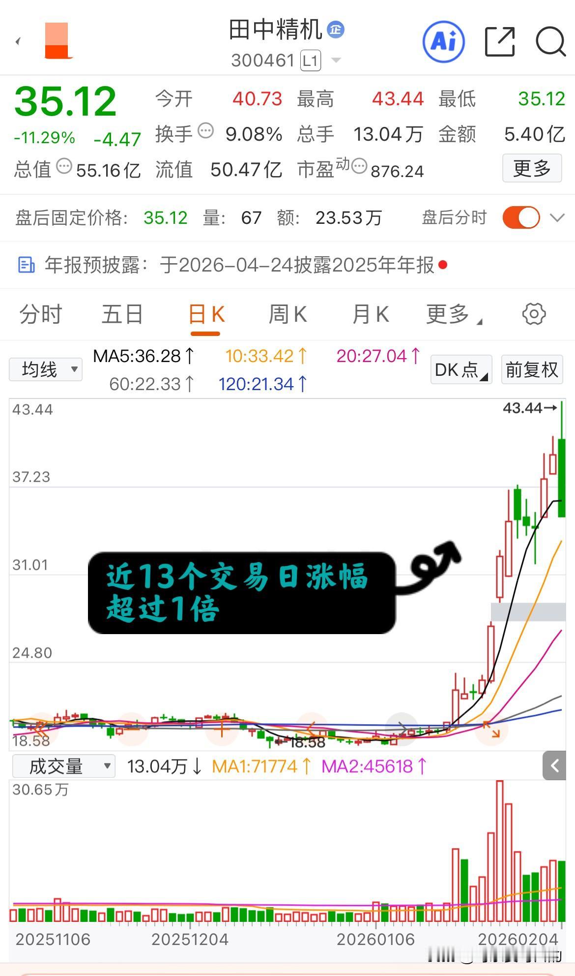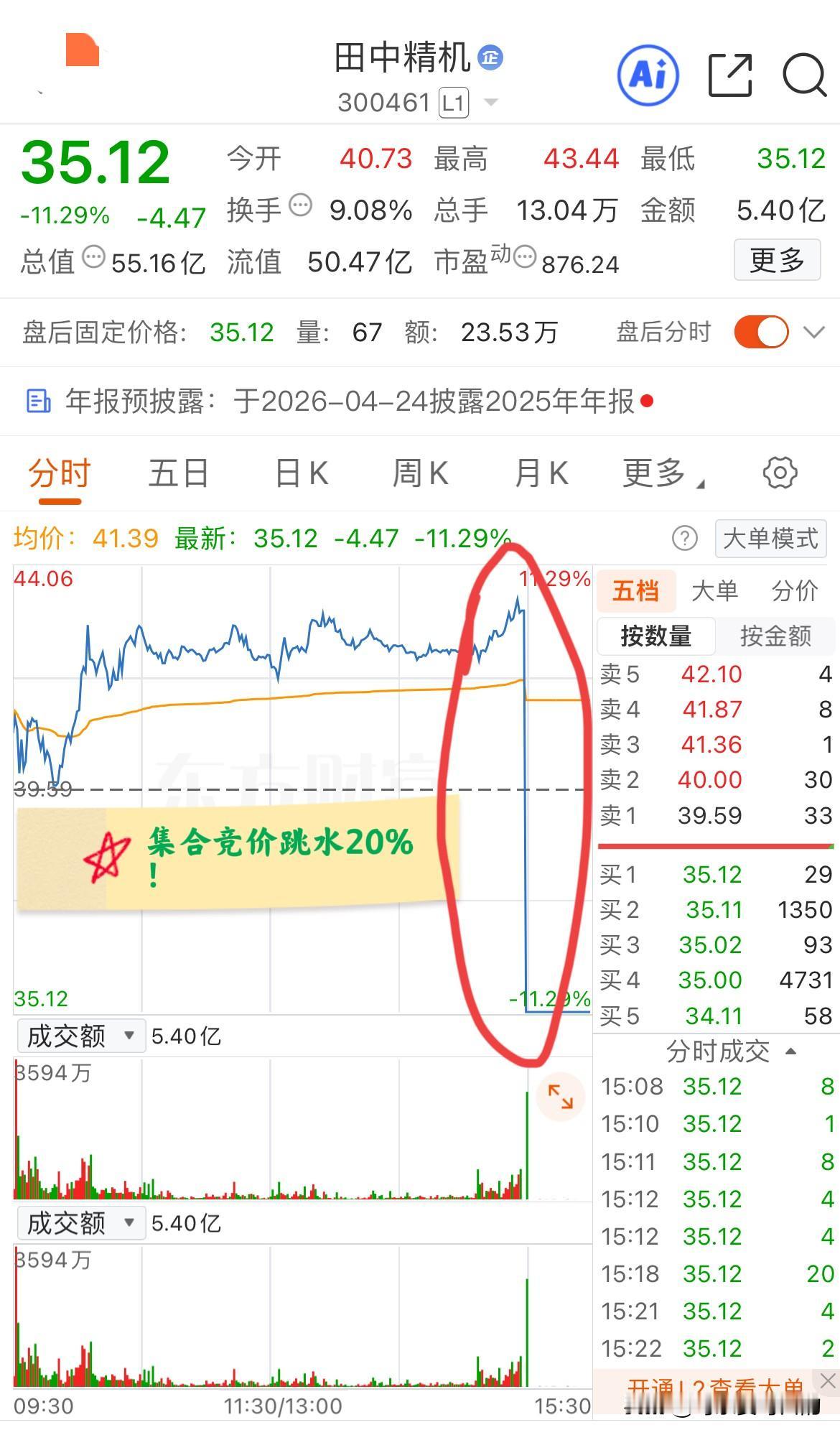 田中精机集合竞价跳水20个点!究竟发生了什么? 今天集合竞价前田中精机的涨幅一度高达9%,而且在集合竞价的前一分钟也都一切正常。 但是在进入2点58分后却风云突变,前一秒还是43.19元的报价却突然跳到了31.67元(跌停价),不过在维持了一分钟后价格开始回升,最终收在了35.12元每股,也就是跌11.29%,最后一秒跳水超过了20%! 本来有股民可能都在提前庆祝今天大涨了,但没想到最后时刻居然来了这么一出,大赚到大亏就在这最后一秒,真的是乐极生悲啊! 至于为什么今天尾盘会出现这种情况,大概率还是因为短期涨幅过大,获利盘利用尾盘出其不意出逃! 要知道田中精机这波上涨行情从1月19日大涨11.3%开始启动,到今天盘中最高位置,短短13个交易日涨幅超过了一倍! 所以以后有股民想追高,尤其是短期涨幅过大的票,大家不妨可以想一想田中精机的今天!