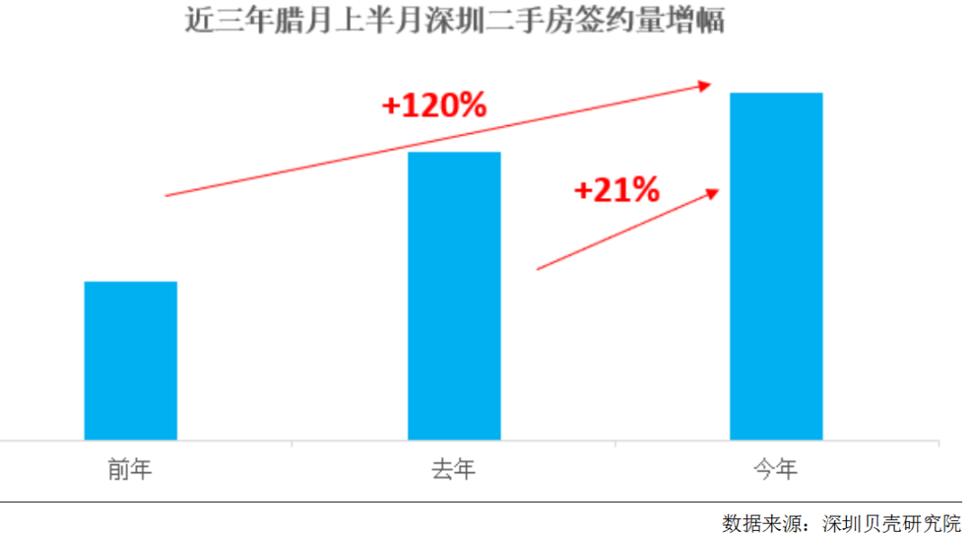 今年腊月(农历十二月)上半月,贝壳深圳合作门店二手房签约量同比增长21%,与前年同期相比更是大幅攀升120%。