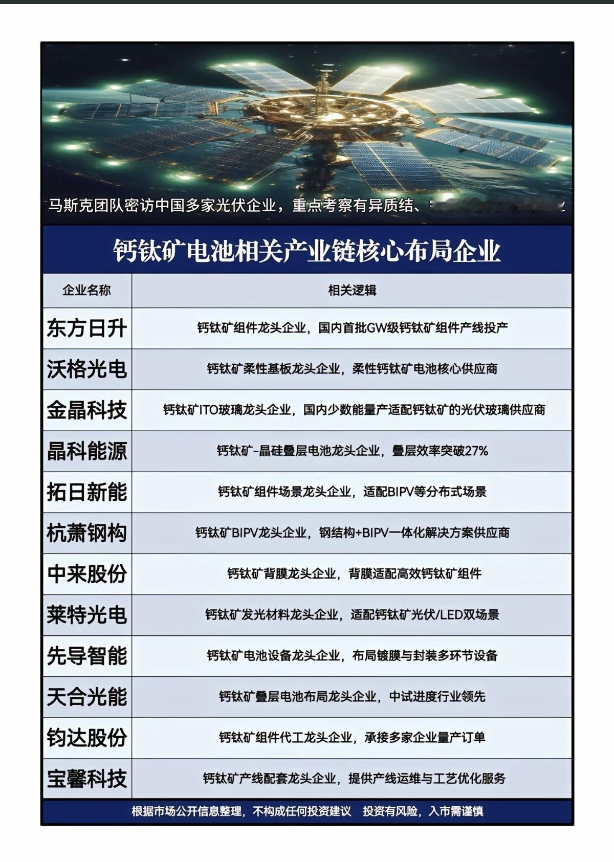马斯克关注方向:钙钛矿电池技术路线! 媒体爆料,马斯克团队秘访中国多家光伏企业,重点考察有异质结、钙钛矿技术路线企业。太空光伏纯正龙头! 相关产业链核心股整理: