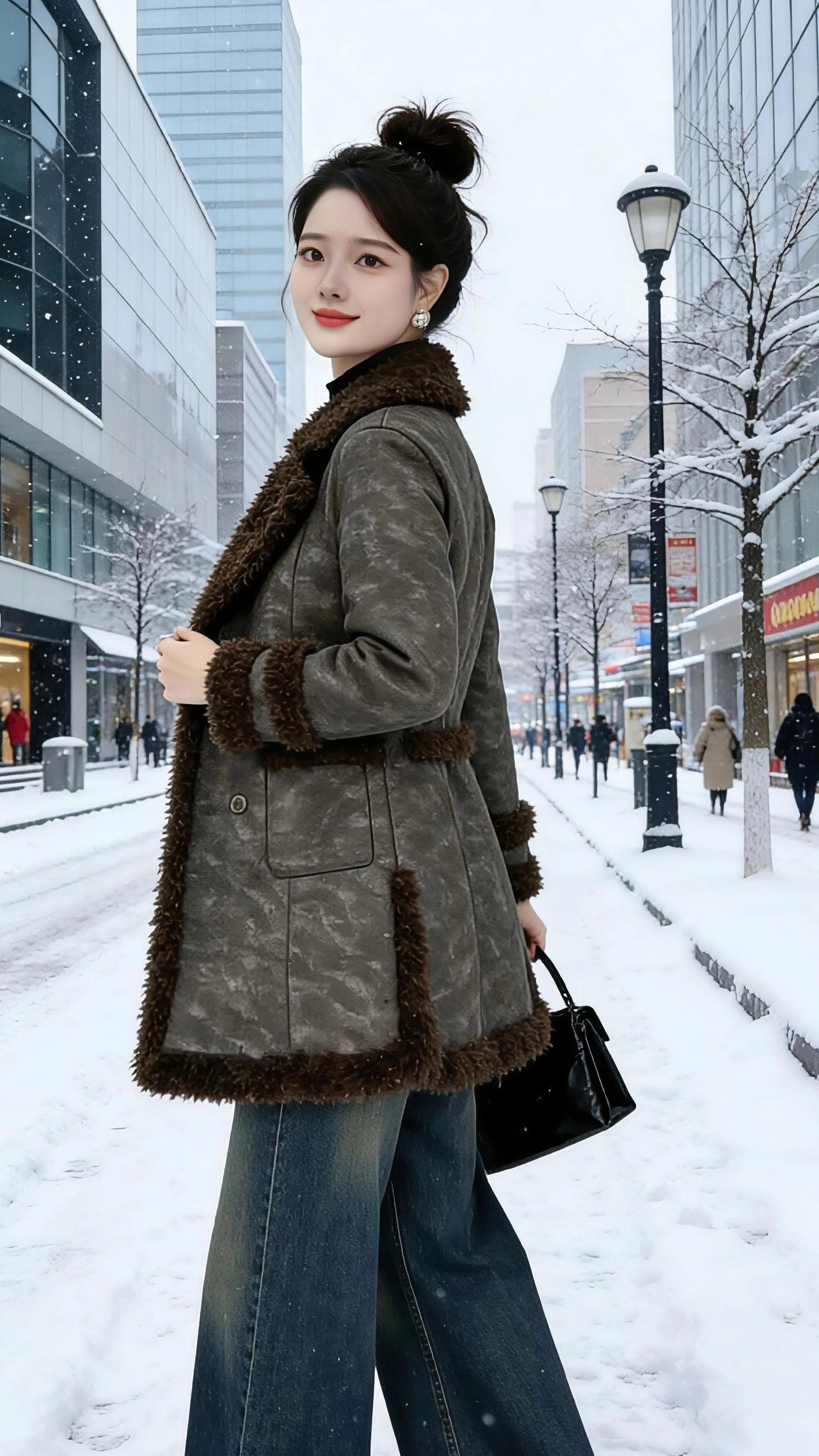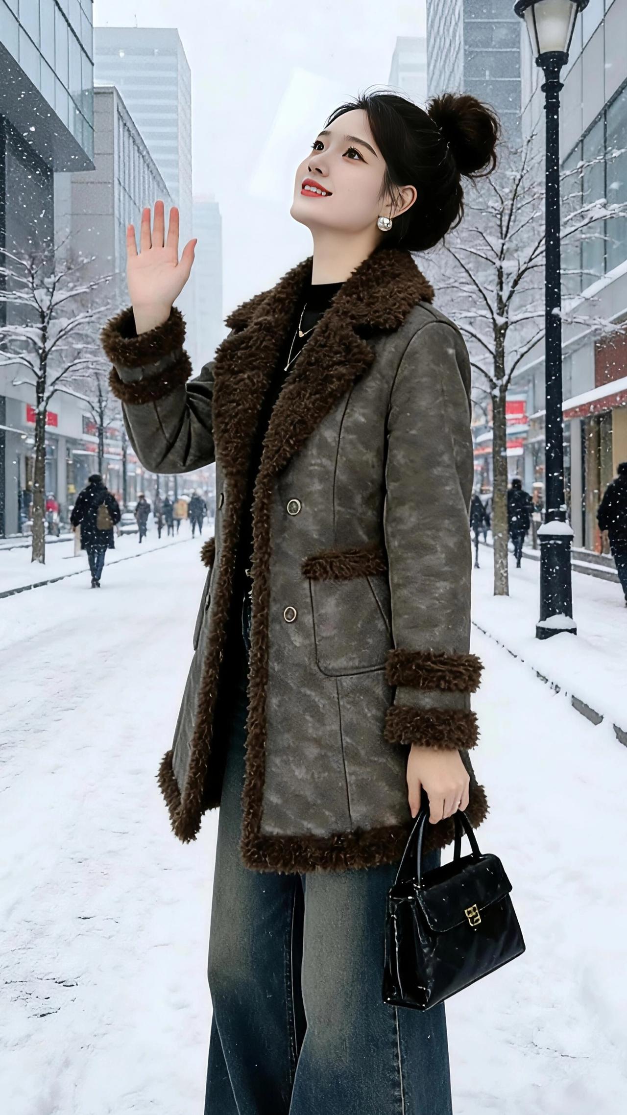 雪色里的红棕序章 当碎雪吻过城市的街面,红砖与玻璃的楼宇间,便漾开了冬日独有的温柔序章。 第一件正红色大衣,像一团行走的焰火,在素白天地里烧得热烈。高领的黑与裙摆的红撞出利落的韵致,腰间系带轻轻一收,便把寒风都锁在了衣料之外。她转过身时,衣摆扫过积雪,留下浅淡的弧,像给冬风题了一句暖诗。 而那件深棕与墨灰交织的皮毛外套,是另一种故事。麂皮的肌理裹着绒绒的毛领,像把整座森林的暖意都缝进了衣身。抬手接雪时,绒毛沾了细碎的白,掌心的温度便顺着布料漫开;比出剪刀手的瞬间,又让清冷的街景多了几分俏皮。当双手在胸前比成心型,雪粒正落在她的发梢,仿佛连冬日都跟着柔软起来。 无论是红裙曳地的明艳,还是皮毛裹身的慵懒,都在这雪色里成了生动的注脚。我们总在冬日盼着暖,却忘了最好的暖意,从来都藏在一件合时的衣、一个舒展的笑,和一场恰好落在肩头的雪。 高级感穿搭 冬季穿搭 新年穿搭 棉衣棉服