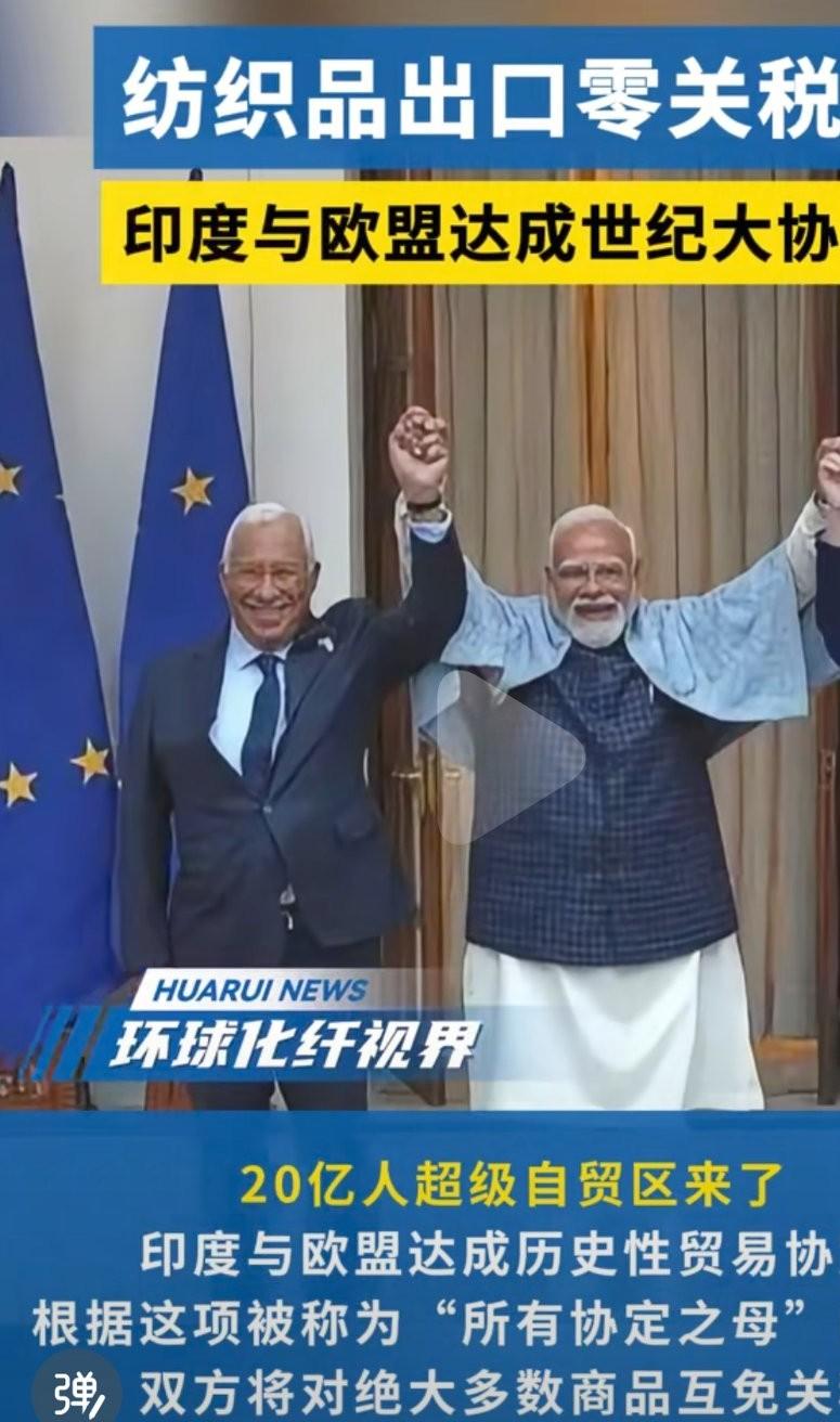 印度和欧盟达成了世界贸易协定,20亿人的超级贸易区来了。到时候双边的很多商品都亙免关税。其实中国和欧盟谈了很多年,到现在一直没有谈成。欧盟之所以和中国没有谈成。他是害怕美国制裁他,打压他。其实中国的经济实力远超印度,他那车不愿意和中国合作,却选择了印度。可能是欧盟觉得印度没有什么威胁,中国不一样,中国的经济实力和整个欧盟差不多,而印度在欧盟亚尼还是一个小人物。没提到威胁吧?但是中国在他们眼里边,经济甚至军事方面都超越了欧洲,他们感觉到恐惧,与中国合作,又担心美国打压他们。