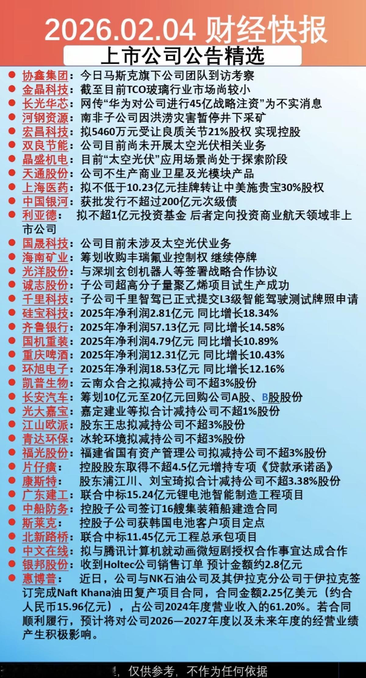 2.04周三 晚间 上市公司公告精选! 主要涉及:马斯克团队到访、重大项目建成试生产、停复牌、股权转让、发行债券收购资产、签订合同,回购股份,另有多家公司发布减持计划。