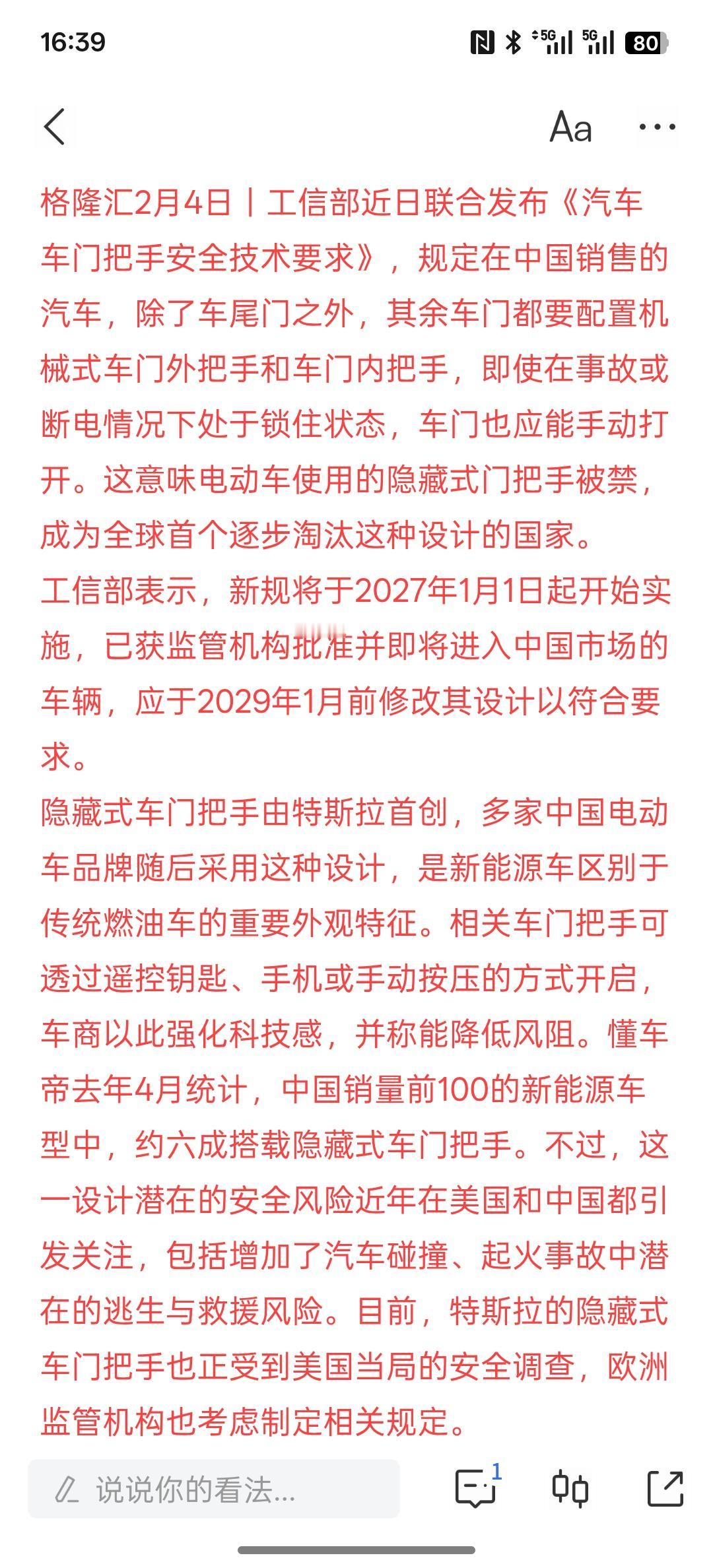 中国这个禁止政策非常,中国禁止隐藏式车门把手 成全球首例,未来,中国将禁止所有的汽车都搞隐藏门把手!隐藏的门把手出现了类似的安全隐患,还是相对比较多,尤其是汽车出现事故的时候,门把手弹不出来,很多汽车门就打不开!这存在安全隐患。如果中国禁止这样的设计方案,在全球应该是值得借鉴的! 而且目前,中国与美国之间特别关注此类门把手的设计!可能在全球统一类似的车门把手设计,将不再是隐藏式的,这个为了安全起见考虑!