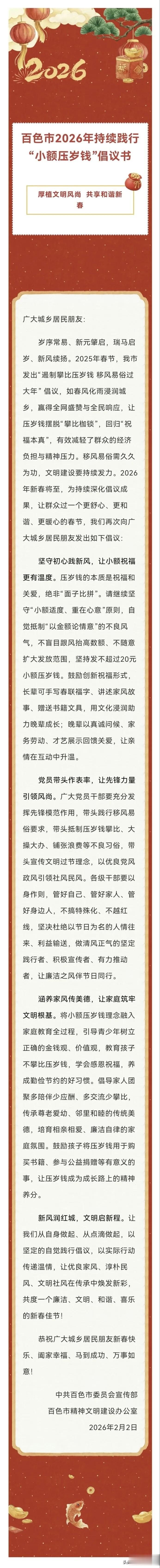 百色喊话:压岁钱 20 块封顶,过年别让红包“压”垮人! 广西百色 2 月 2 日又发倡议:今年过年红包压岁钱,建议一律不超 20 元。不是抠门,是官方连续第二年喊“小额适度、重在心意”——压岁钱是祝福,不是面子比拼,别卷金额、别乱扩范围。 核心就三句: 1️⃣ 钱数:直系旁亲、邻居小孩,都按 20 元以内包,不搞“200 起步、500 起步”那套; 2️⃣ 形式:长辈可以改手写春联、讲家风故事、送书本文具,晚辈用问候、家务、才艺回礼; 3️⃣ 心态:党员、干部先带头,家长教孩子“不攀比、懂感恩”,压岁钱买书、做公益更香。 为啥全网喊“求全国推广”? 这几年不少地方压岁钱从几十涨到几百上千,老人、年轻人过年像“渡劫”。百色这波 20 元线,本质是给人情债“减负”:减的是经济压力,不减的是亲情温度——广东“5 元利是”能走天下,广西 20 元一样够暖。 今年你家要是也纠结“包几多”,不妨学百色: - 金额:就定 10~20,亲戚统一口径; - 花样:加句手写祝福、陪娃读本书,比塞钱更有年味。压岁钱回归“压祟祈福”的本意,过年才真叫“轻松又暖心”。