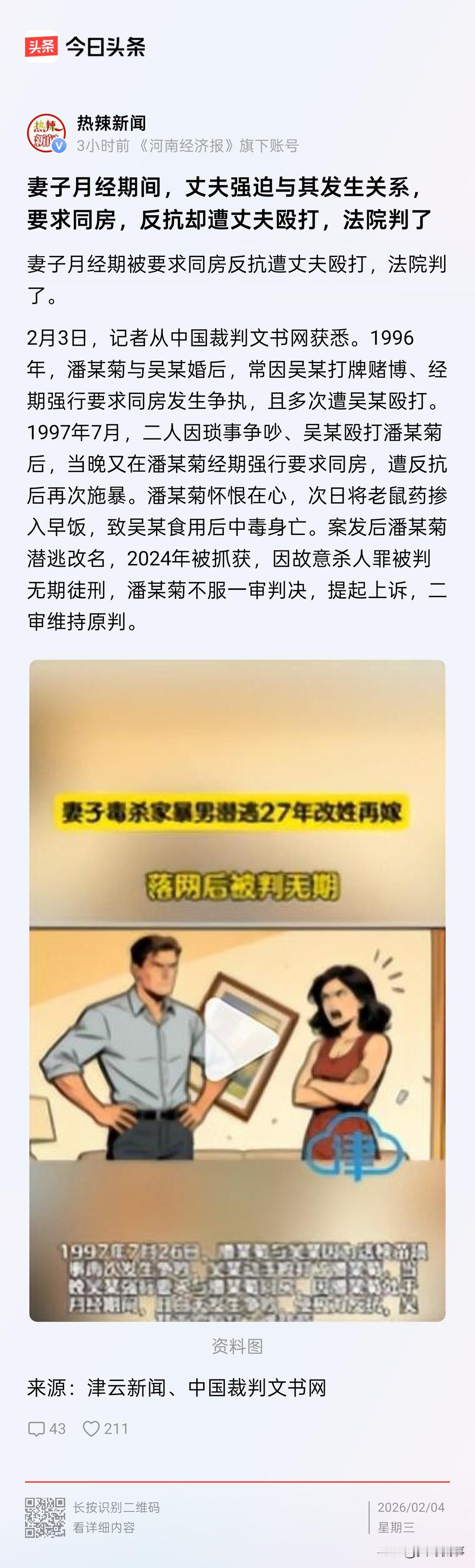 “冲动是魔鬼!”江西,女子婚后遭到丈夫百般折磨,甚至在经期期间,都被丈夫要求发生关系。最终,忍无可忍之下,女子买来老鼠药,在做饭时掺入其中并让丈夫吃下,丈夫中毒身亡。随后,女子开启逃亡生活,直到27年后被抓获归案,案件经过两审,女子获刑无期。网友:“以暴制暴,太不值了!” 1996年,女子潘某和丈夫吴某结婚组建了家庭。可婚后的生活,却和她起初预想的完全不一样: 丈夫吴某不仅沉迷打牌赌博,还经常因为琐事对她大打出手,更让人无法接受的是,吴某全然不顾她的生理状况,竟多次在她经期强行要求同房。 一旦遭到反抗,就会对她实施更凶狠的殴打,长期的身体伤害和精神压迫,让潘某一直活在痛苦之中。 1997年7月的一天,两人又因为小事发生争吵,吴某二话不说就对潘某进行殴打,到了当天晚上,吴某再次在潘某经期提出无理要求,被拒绝后,他又一次对潘某施暴。 接连的殴打和屈辱,让潘某内心积攒的怨恨彻底爆发,她失去了理智,第二天一早,在做饭时,她把此前买好的老鼠药掺进了早饭中,吴某吃下后,最终中毒身亡。 事情发生后,潘某选择逃跑,还改了名字四处躲藏,这一逃就是27年,直到2024年,她才被警方抓获归案。 诚然,我们难以想象潘某此前遭遇过什么,但一定是让她非常绝望、看不到半点出路的折磨,才会把一个原本只想安稳过日子的普通女人,逼到用投毒这种极端方式了结痛苦。 但即便如此,她的“以暴制暴”的做法属于剥夺他人生命的行为,终究要为此付出代价。 潘某使用投毒方法杀害吴的行为成立故意杀人罪。 根据《刑法》规定,犯故意杀人的,处死刑、无期徒刑或10年以上有期徒刑。 考虑到吴某长期实施家暴,自身存在重大过错,据此对潘某予以酌情从轻处罚,但因其故意杀人的犯罪后果极其严重,一审法院最终判处其无期徒刑。 吴某不服,上诉,二审维持原判。 有网友说:“潘某这不是正当防卫吗?如果她不弄死吴某,以后还会受到伤害的啊?” 在这里,潘某的行为并不算是正当防卫,正当防卫要求不法侵害现实存在且正在发生。 而潘某的投毒行为,是在暴力停止后的第二天才主动实施的,属于有预谋的报复,并非是面对正在发生的侵害进行反击,因此不能认定为正当防卫。 当然,也并不是说潘某除了杀了吴某就没有解决问题的方式了。 潘某作为家暴的受害者,她可以在当时选择报警、申请人身保护令、起诉离婚等合法方式摆脱困境。 但她却用极端的方式了结矛盾,最终从受害者变成了犯罪分子,实在令人惋惜不已。 从潘某的遭遇来看,也能给大家一些启示: 家暴从来都只有“零”次和无数次!忍耐也从来都不是长久之计! 当对方打你的时候,第一时间要去医院验伤并留存证据。实在过不下去,可以起诉离婚;人身安全受威胁,可以向法院申请人身保护令,让对方不能靠近、不能骚扰。 总之,在婚姻中遇到伤害、委屈、暴力,最不能做的就是一忍再忍,最不该做的就是自己以身试法。要懂得用法律保护自己,及时止损、合法脱身,才是真正对自己负责,也才能真正走出噩梦、重新开始。 对此,你怎么看?欢迎大家在评论区留言。