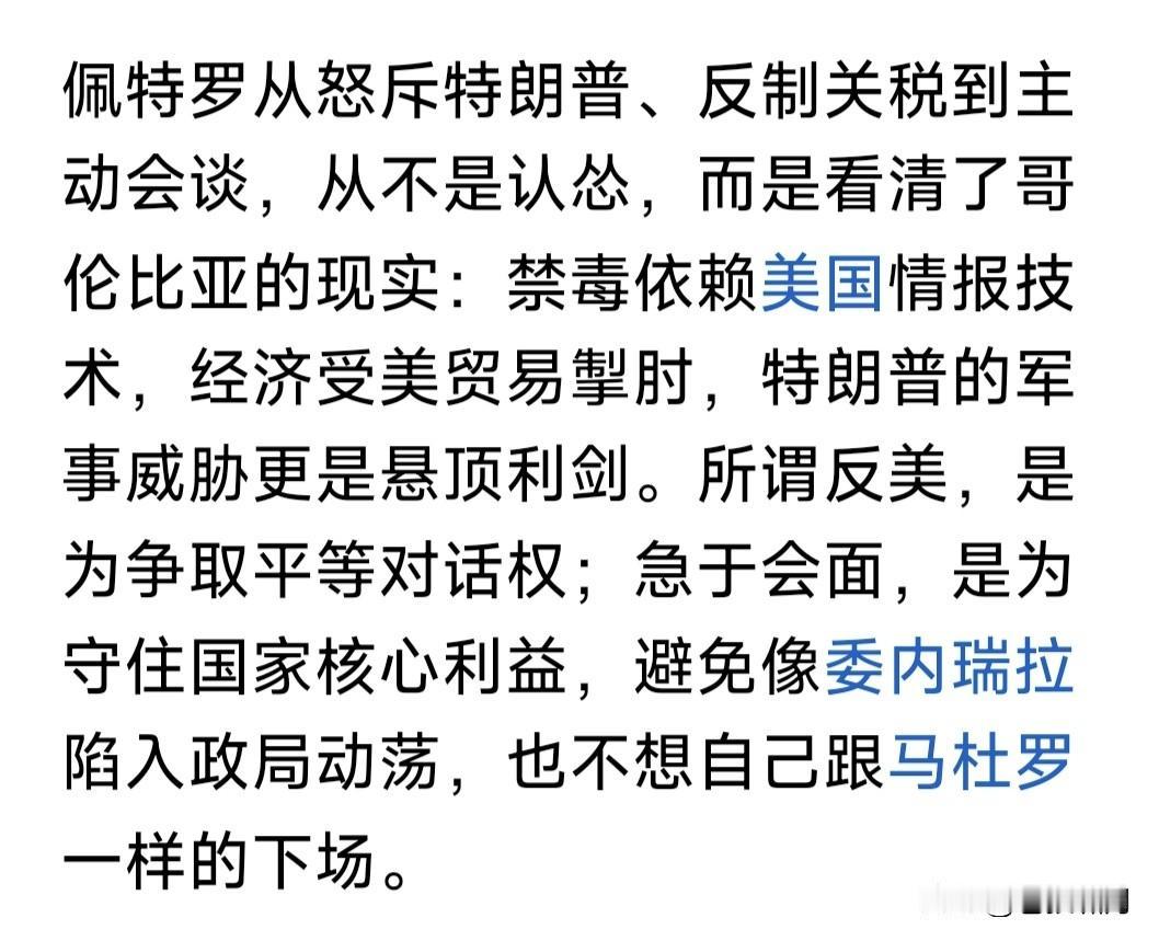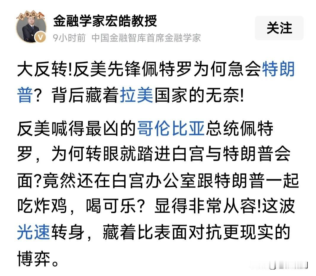 从“反美英雄”到美“座上宾”,哥伦比亚总统佩德罗的转变,令人始料不及! 记得此前不久,川普抓捕马杜罗,说下一个就是佩德罗!佩德罗勃然大怒,隔空喊话老特:我等着你呢!来抓我啊! 但喊话之后,就向老特传信:愿意赴美会谈,解释哥伦比亚禁毒情况和经济问题。这不刚过不久,就真来美国了。 看网友图文,川普足够大度,抬手不打笑脸人!与老佩热情见面会谈,还在办公室宴请他,一起吃炸鸡,品可乐! 佩德罗表现也老练,面带微笑,十分从容,忘记了此前隔空喊话叫阵,怒斥川普强权的事!像老朋友见面一样啊! 透过现象看本质,这是没办法的事!老美军事强大,川普专治各种不服。尤其眼皮地下这些小国,想治谁很容易。 不说像对委内瑞拉,直接抓捕马杜罗,逼迫代总统就范!就像对古巴那样全面封锁,让你民不聊生,也很难受吧! 说一千道一万,佩德罗还是聪明人!为了国家经济发展,人民生活不受困,个人抹下脸面,主动赴美求和又何妨? 据特朗普宣称,古巴高层也托人传信,要与他进行谈判了!果真如此,对美古双方都是好事,和平总比战争好嘛! …………