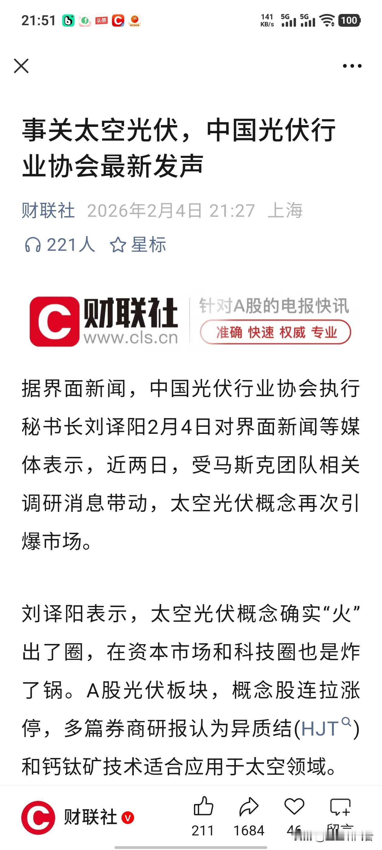 太空光伏:协会泼冷水,A股要降温 马斯克团队来中国看光伏厂,太空光伏概念又炸了锅。A股一堆光伏股连拉涨停,券商研报把“异质结”“钙钛矿”吹成“下一个万亿蓝海”。但中国光伏行业协会今天出来泼了盆冷水:这玩意儿现在还只是“故事”,离真正落地还远得很。 协会说,现在真正在太空里扛大梁的,是砷化镓电池——贵是贵,但效率高、抗辐射强,空间站、卫星用了这么多年,靠谱。而市场炒得飞起的异质结、钙钛矿,更多是券商自己算出来的“降本逻辑”,产品还在实验室或刚起步验证,能不能扛住太空极端环境、能不能稳定量产,都还没谱。 说白了:太空光伏方向没错,但眼下更多是资本在炒概念。产业真要干成,得先老老实实把制造工艺做成熟、把可靠性验证跑完,而不是光在PPT上喊“革命”。 对A股市场影响:短期降温,长期不改方向 1. 纯概念股大概率要“挤泡沫”这两天涨得最疯的,多是蹭“太空光伏”“HJT/钙钛矿上天”标签、但实际业务还在地面电站的小票。协会明确点出“技术尚在实验室、商业化遥远”,等于给这类票贴了“高风险”标签。接下来几个交易日,大概率会出现: - 跟风涨停的标的(尤其小市值、无实质订单的)放量回调; - 盘中波动加大,游资接力意愿下降。类似国晟科技、双良节能这类已公告“未涉太空光伏业务”的,若再冲高,抛压会更重。 2. 龙头光伏股:情绪降温,但未必深跌晶科、天合、中环等龙头,这波上涨既有“太空光伏”题材,也有马斯克调研+行业排产边际改善的支撑。协会发声后: - 短期情绪溢价会被压缩,涨幅收窄甚至小幅回踩; - 但基本面(装机需求、出口退税取消后的行业出清)逻辑未变,大概率是“高位震荡”而非单边杀跌。真正决定它们走势的,还是2026年Q1业绩和硅料/组件价格,而不是太空故事。 3. 资金风格切换:从“故事”回“业绩”协会这次点名“券商研报互相引用、资本炒作”,相当于给监管预期加码。后续: - 交易所问询函、异常波动公告可能增多(类似2月4日多家公司紧急澄清“无太空业务”); - 资金会更偏好有实际订单、技术验证进度清晰的标的(如砷化镓空间电池供应商),而非纯PPT公司。光伏板块内部会从“鸡犬升天”转向分化:有真东西的扛得住,纯蹭概念的容易A字杀。 4. 中长期:不改赛道逻辑,但节奏放慢协会没否定太空光伏方向,只是强调“技术需时间验证”。对市场意味着: - 2030年以后的万亿空间预期仍在,但2026—2028年业绩贡献几乎为零; - 后续行情更可能走“进二退一”:每有技术突破或卫星发射催化,脉冲一波,但炒高后容易回吐。投资者如果想参与,更适合按“主题波段”而非“长线躺平”来对待。 一句话总结:协会发声=给狂热概念降降温。短期看,纯题材股风险大于机会;中长期看,光伏板块还是要回归基本面——谁能在地面电站赚钱,谁才有资格讲“上天”的故事。(内容仅供参考,不作为投资依据)