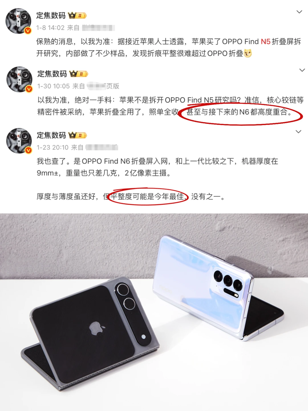 据说26年苹果首款折叠屏iPhone Fold就要来了,这机子的一大目标就是要实现“无折痕”视觉效果,爆料称苹果内部还研究了OPPO Find N5,并采纳了N5的核心铰链等精密件,两家的技术同源,但更新的技术还是Find N6先用!