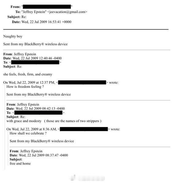 爱泼斯坦用一个下流的笑话回应,提到两个脱衣舞娘的名字: “带着优雅和谦逊(Grace and Modesty,这两个是脱衣舞娘的名字)”