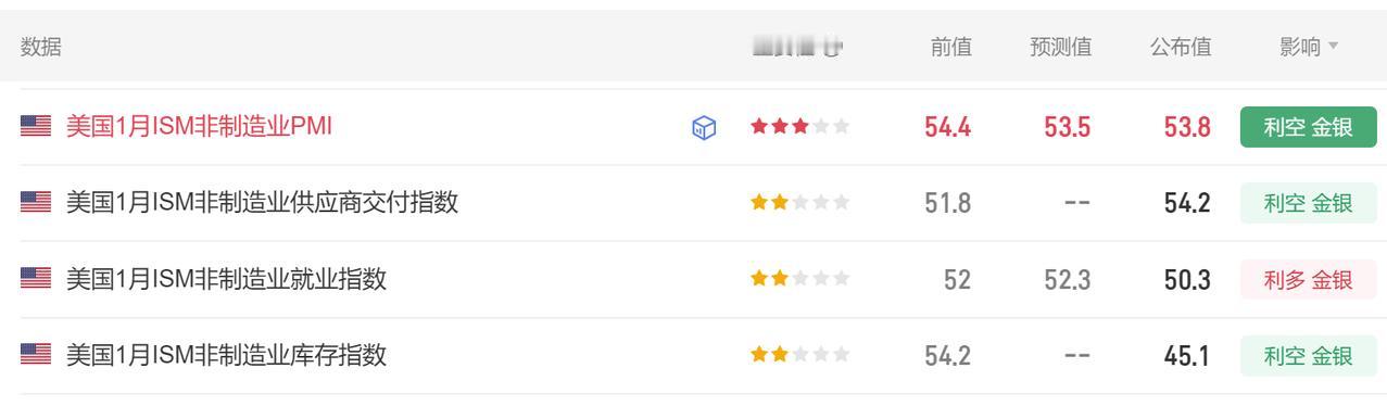 黄金和白银是否还有上涨空间呢? 今晚的经济数据比较多, 美国1月ISM数据也公布了。 首先美国1月ISM非制造业PMI 53.8, 市场预期53.5,前期数值54.4。 其次美国1月ISM非制造业新订单指数 53.1, 市场预期55,前期数值57.9。 最后美国1月ISM非制造业物价指数 66.6, 市场预期65,前期数值64.3。 还有美国1月ISM非制造业就业指数 50.3,预期52.3,前值52。 这四项数据,有三项是利空的, 数据公布以后,国际金价顺势下跌几十美元。