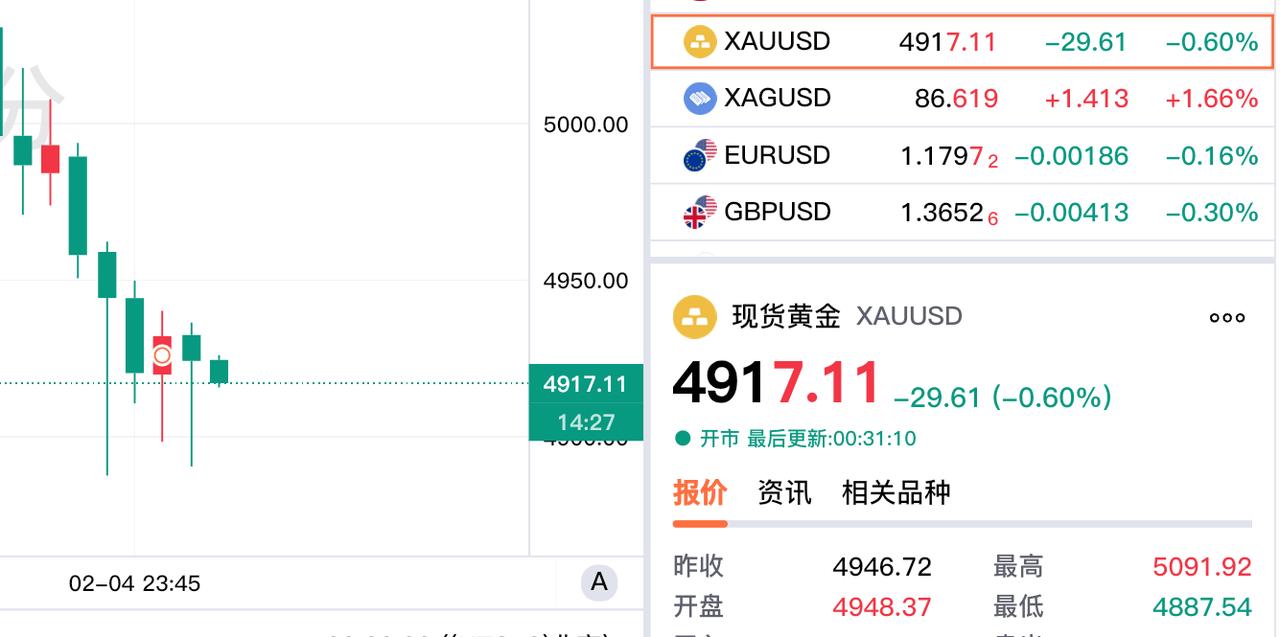 黄金和白银是否还有上涨空间呢? 今晚现货黄金再度震荡下行, 由涨转跌,盘面再度回落。 现货黄金报价4917.11美元, 较上一日回落29.61美金, 跌幅不大,仅为0.6%; 但是一个不好的信号。 刚刚盘中最低跌至4887.54美元, 比起日内最高的5091.92美元, 回落二百多美元。 对于现货黄金后市, 期货小褚比较看好, 还是认为节前有突破5100美元, 达到5150--5200美元的概率!