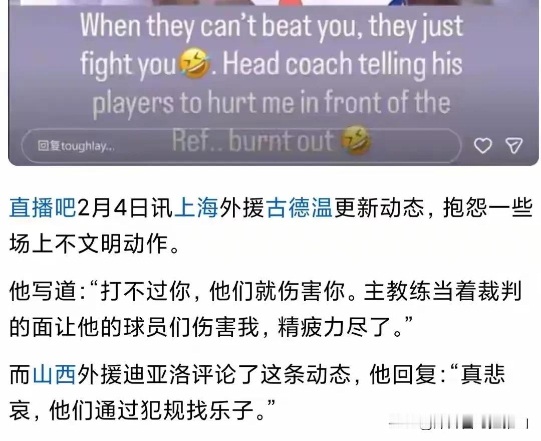 杜指导搞心态可是CBA的顶级!去年广东队和山西队的比赛中,由于迪亚洛进攻太猛,让广东队任何一个队员都防不住,所以杜指导采取了上策——攻心搞乱心态的战术,如图一,杜指导对着迪亚洛一顿英语指导,注意看口型哦。 这时候迪亚洛也聪明,知道球队领先,为了不受到外界干扰用双手把耳朵堵上来个耳根清净。最后山西队三场比赛全赢横扫广东队,一共赢了75分。 前天古德温说某主教练当着裁判的面要他的球员伤害他也很正常,虽然古德温听不懂汉语,但是国内球员懂啊,毕竟古德温是上海队主力1号位,肯定会告诉他得提防着点,都知道怎么保护他。 各位球迷们,你认为古德温说的是真的吗?