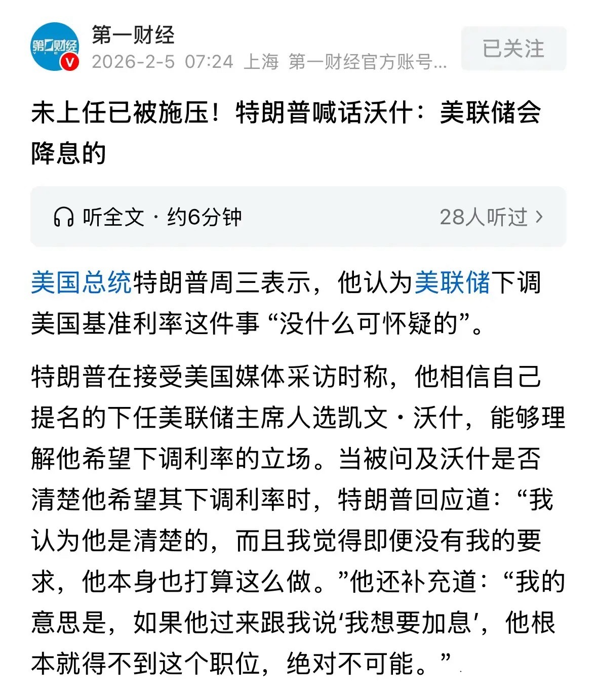 重磅利好消息特朗普正式喊话美联储降息,美股跌幅缩窄后今天期指高开:2月5日一觉醒来昨晚美股暴跌!但迎来了重磅利好消息,美国总统特朗普周三正式在公开场合接受采访时喊话下任美联储主席沃什:他认为美联储下调美国基准利率这件事没什么可怀疑的。特朗普的话很直白,十分肯定:如果他说要加息,根本不会得到这份工作。这消息利好美股和全球股市,美股大幅下跌后尾盘拉升跌幅收窄。