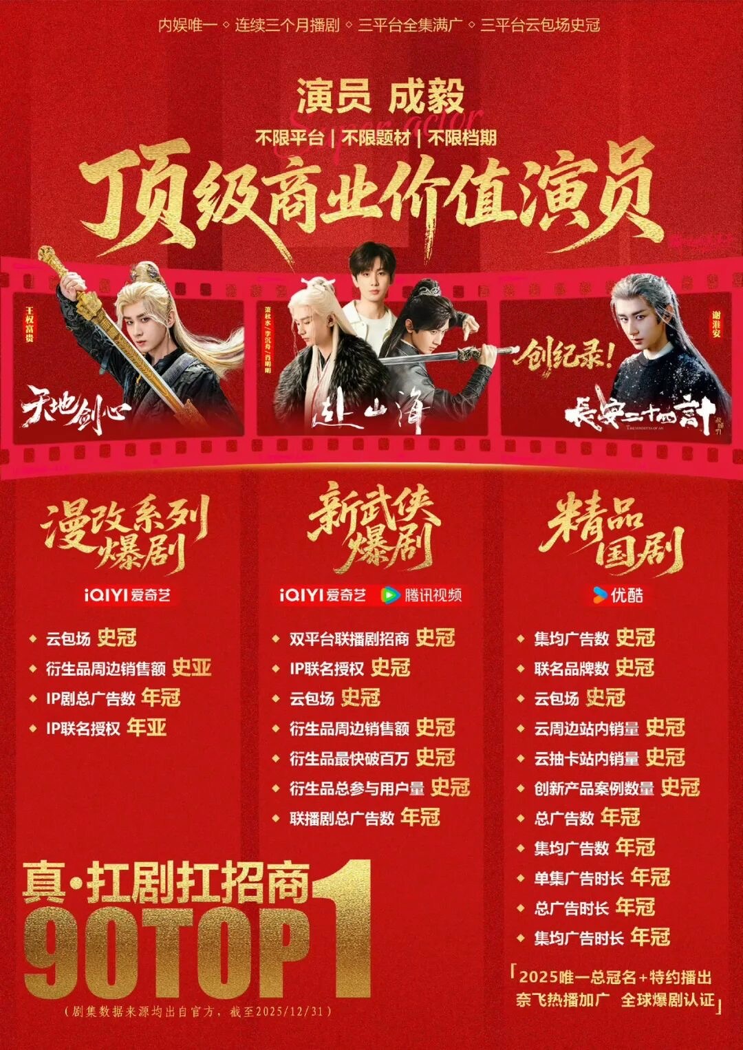 ie还是吹少了,影视寒冬,播剧就老实的含金量还在上升。不是每个演员都能经得起这个行情播剧的考验,更何况还是连着播。现在的长剧市场,就是要看谁的剧粉盘大,谁的粉丝多,谁能扛招商。很多人现在才意识到25年暑假后长剧行情变了,而成毅2025年年底《赴山海》《天地剑心》《长安二十四计》连续的成功,在这样的长剧市场,更能突出证明了他稀有的“扛剧”能力,不仅每个角色都非常出圈,用最少的营销最高的讨论量,更转化为了顶级的商业价值。成毅尊重观众,尊重每个角色,一步一个脚印,早已成为剧集品质与商业回报的金字招牌。业内认可观众信任,影视寒冬,真扛剧演员尤为珍贵。
