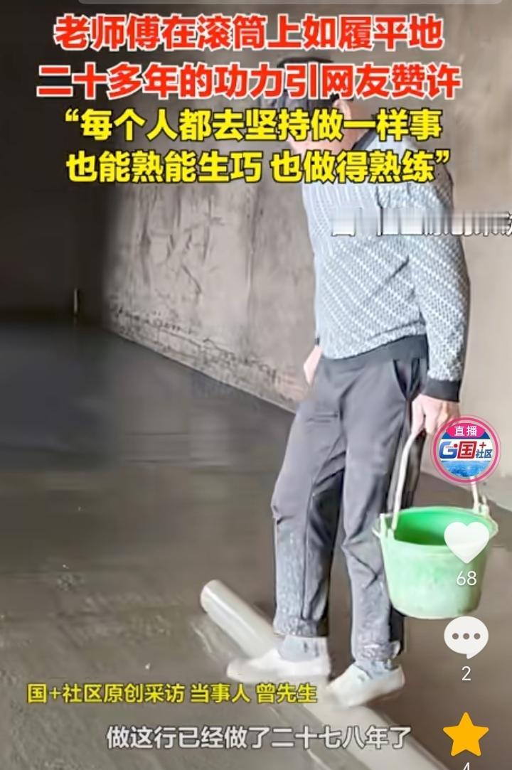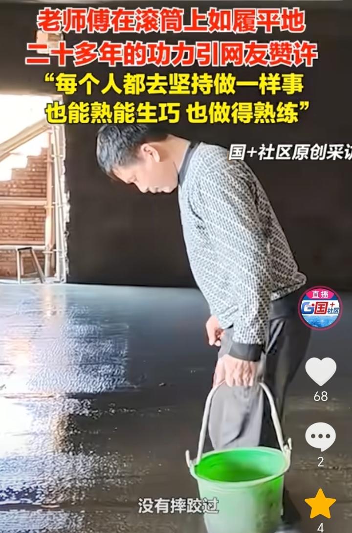 熟能生巧!广东梅州,男子做地面二十多年,现在不仅有这高超的技术,而且还练就了绝活,视频中可以发现,男子双脚踩在滚筒上工作时如履平地。男子表示,没有摔跤过,时间久了熟能生巧,每个人都去坚持做一件事,也能熟能生巧。 没有多年的功底确实做不到踩在滚筒上还能如履平地一般,这样平地面,不仅省时还能省力,不过这背后是需要付出很大的努力,才会有现在的熟练程度。 俗话说得好,“只要功夫深,铁杵磨成针”所以不管做什么都要用心去做,时间久了也就可以熟能生巧。 男子有着二十多年的经验,不仅练成了绝活,而且把钱也赚了,可以说是一举两得。