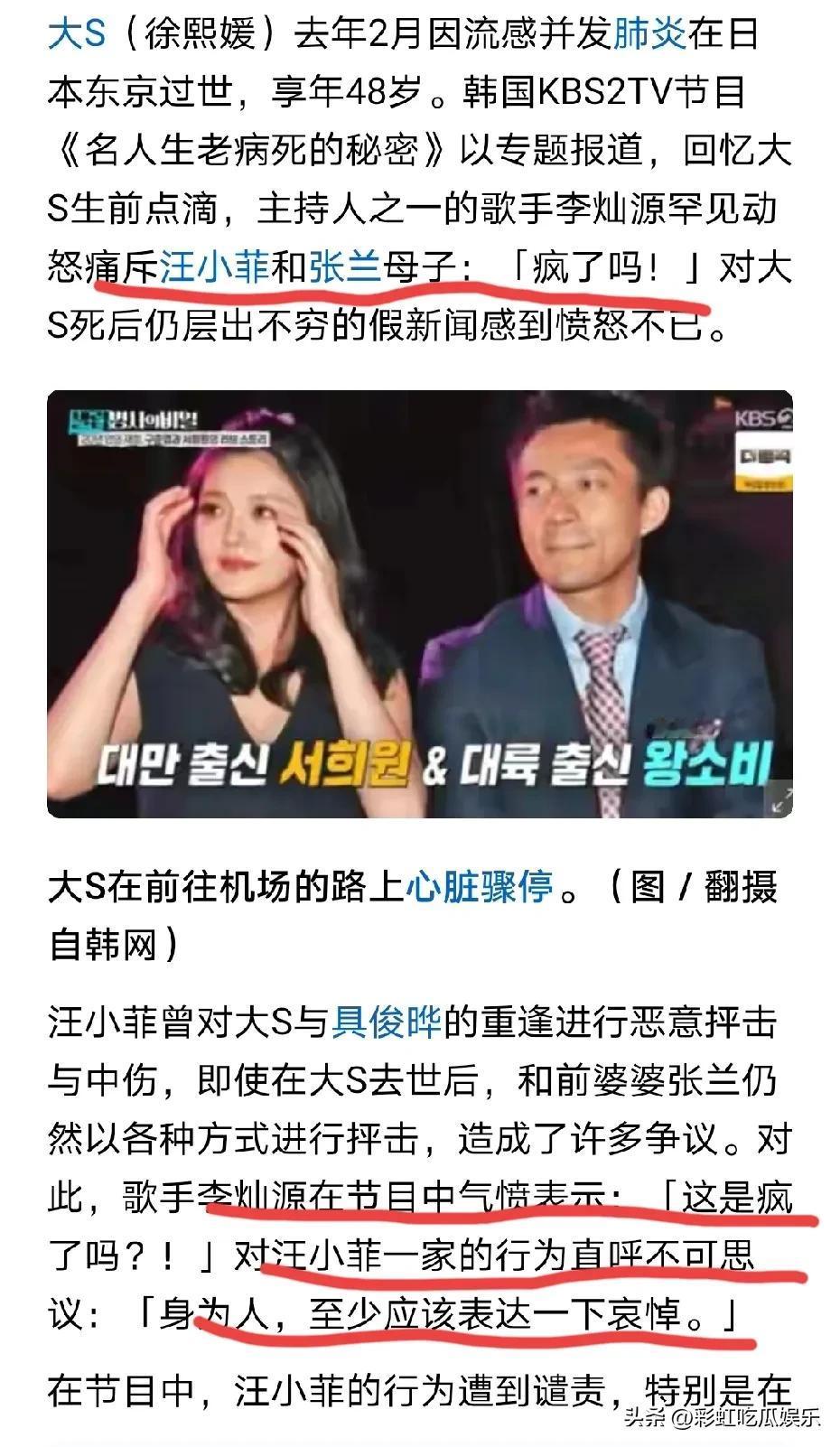韩媒痛批汪小菲张兰,疯了吗?对汪小菲一家的行为直呼不可思议。 这是一个洗白具俊晔的节目,大S离世他们不指责小S和S妈喝酒跳舞,还来指责汪小菲张兰蹭热度,表演深情贼喊捉贼。 他们把汪小菲搬上电视一起围攻他,其实汪小菲至少在雨中跪拜了她,张兰停播了两天悼念她,作为前婆婆前夫能做到这个份上已经很不容易了。 具俊晔公然榨干大S的最后一点价值,还被韩媒追捧,简直是乌合之众。