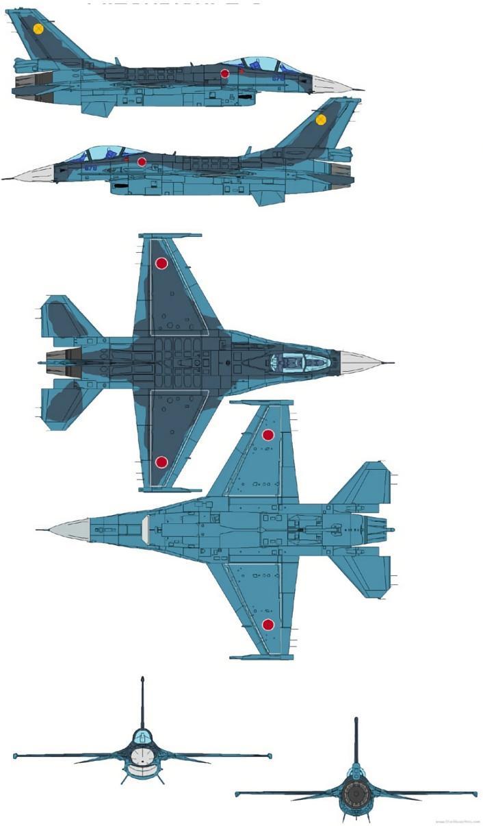由于F-2战斗机是以美国F-16C/D战斗机为蓝本设计的,所以其动力设计、外形和搭载武器等方面都吸取了不少F-16的优点。但为了突出日本国土防空的特点,该机又进行了多处改进,其中包括:采用先进的材料和构造技术,使F-2机身前部加长,从而能够搭载更多的航空电子设备;配有全自动驾驶系统,机翼大量采用吸波材料以降低雷达探测特征等。F-2战斗机装有1门JM61A1“火神”机炮(备弹512发),并可携带8000千克导弹和炸弹等武器。