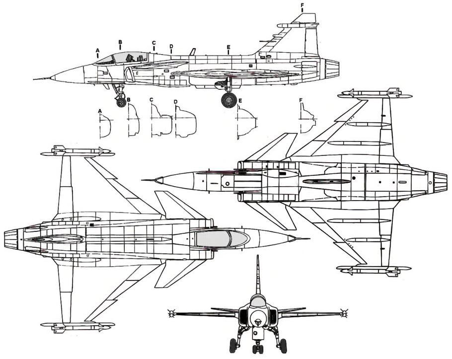 JAS 39战斗机使用鸭形翼(前翼)与三角翼组合成近距耦合鸭式布局,结构上广泛采用复合材料。该机的出厂成本只有“台风”战斗机或“阵风”战斗机的三分之一,但同样具有良好的机敏性和较小的雷达截面,较小的机身也降低了飞机的耗油率。JAS 39战斗机装有1门27毫米毛瑟BK-27机炮,备弹120发。机身和机翼下共有8个外挂点,可携带AIM-9“响尾蛇”空对空导弹、AIM-120“监狱”空对空导弹、“流星”空对空导弹、KEPD-350空对地导弹、AGM-65“小牛”空对地导弹、RBS-15反舰导弹、“铺路”系列制导炸弹和Mk 80系列无导引炸弹等武器。