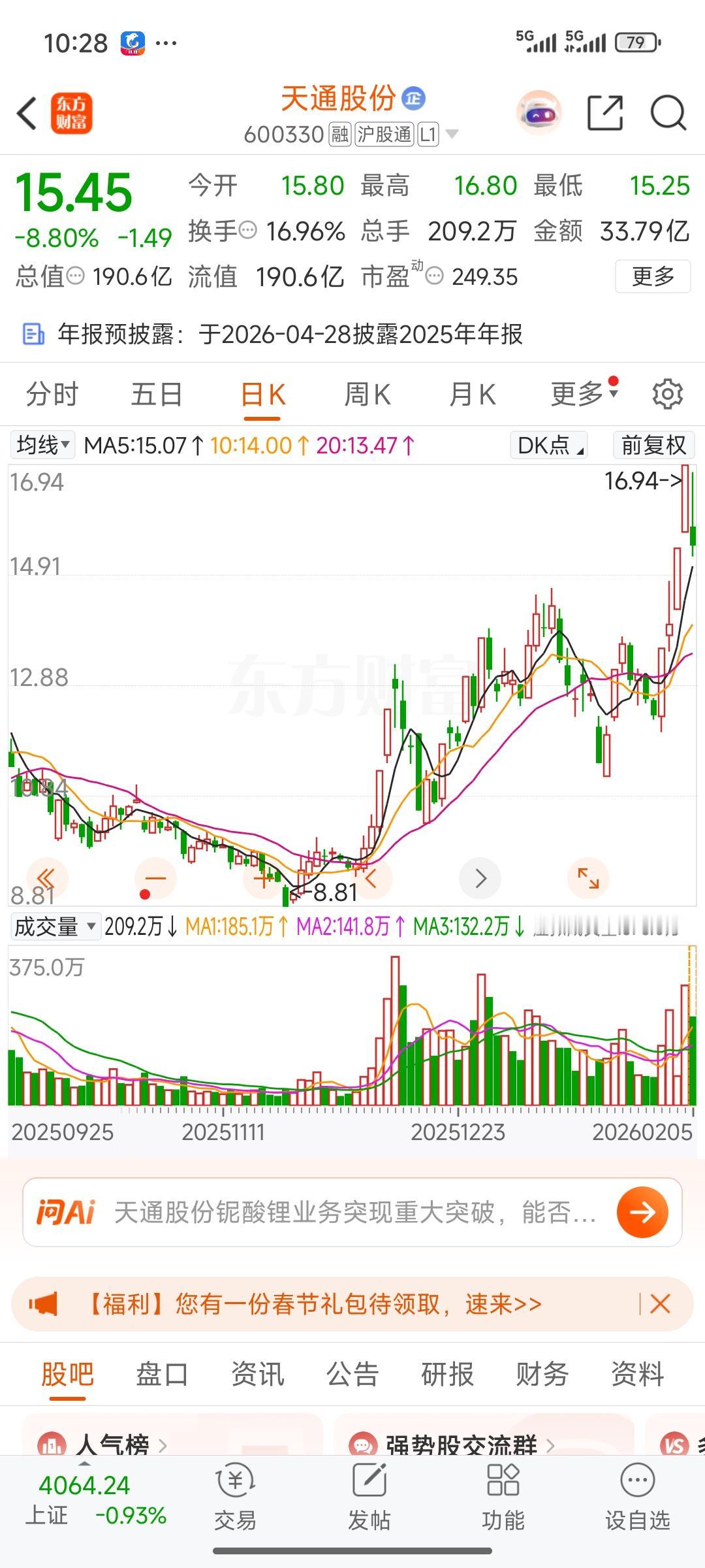 我去,这是怎么回事?天通股份今日大幅低开,或许和昨日的异动发布以及公司回复称与太空光伏无关。今天股价大幅低开后一度向上拉升,可现在又转头向下,逼近跌停。短线波动实在太大了!幸亏昨天卖掉了剩下仓位的一半中的一部分,不然心态真要崩了,一直在得与失之间反复徘徊。反复震荡,反复折磨,也就只有在咱们大A混了。想赚点小钱,太难了,剩下的四分之一仓位又回到了待解套状态。是继续持有,还是趁没跌停之前抛掉?这真是个摆在眼前的难题,太纠结了。 股友们,你们是怎么对待的呢?地天板股票 天普股份龙虎榜 天普股份 航空天板块 天地板股票 股市地天板 天特股份