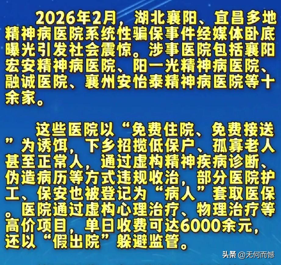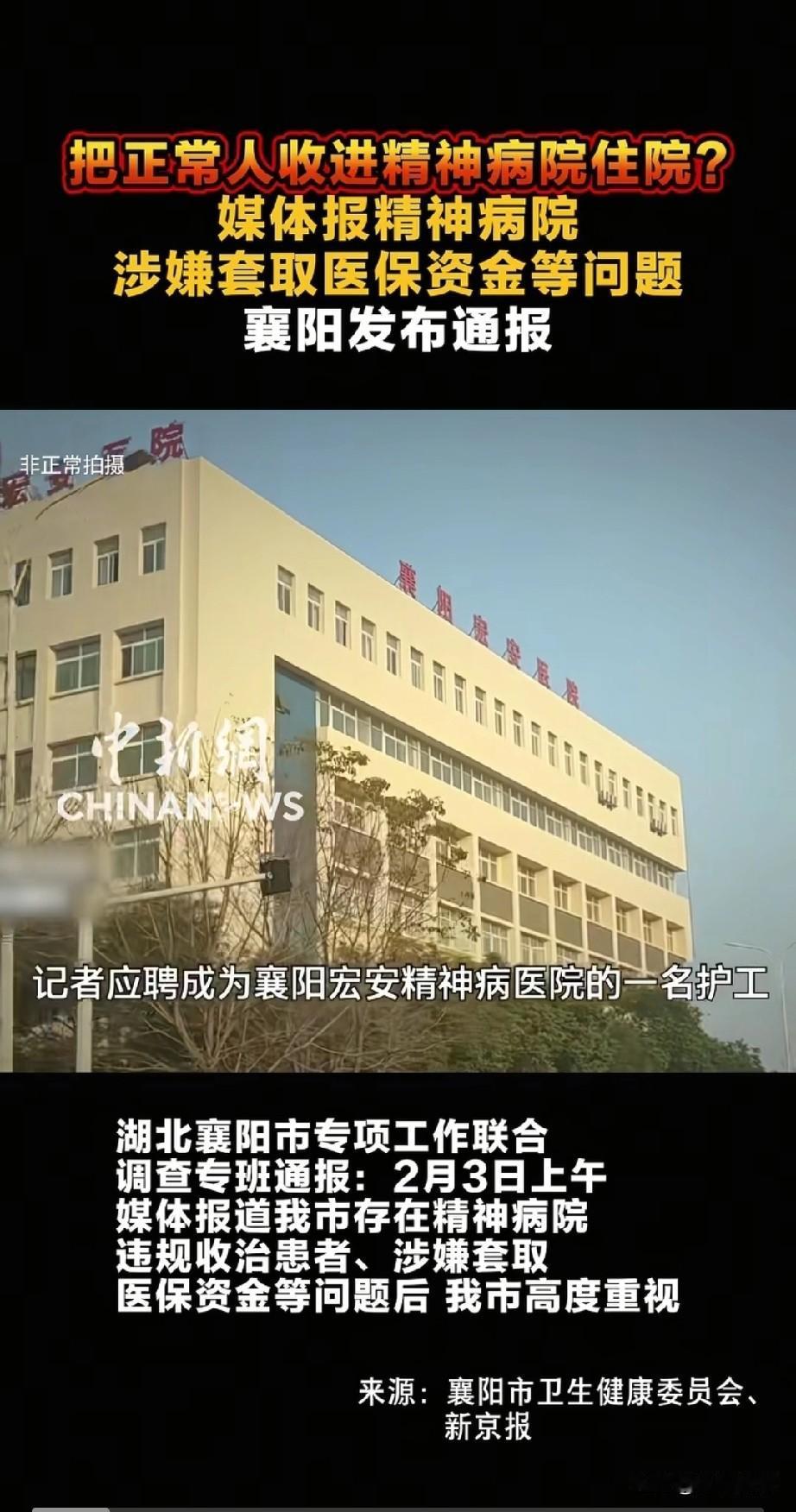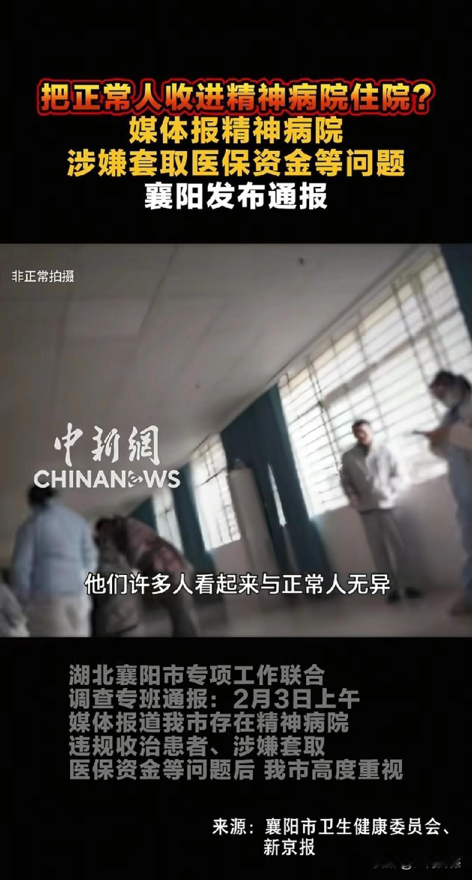 襄阳、宜昌的精神病医院,把黑手伸向了普通老百姓,骗取国家资金,限制老百姓人身自由,性质相当的恶劣,这些人简直就是无法无天,为了追求经济利益,无限放大了人性之恶。记者扮演成护工,了解到了真相,如果没有记者的深挖爆料,谁能知道,在精神病医院里还隐藏着这么多罪恶!
