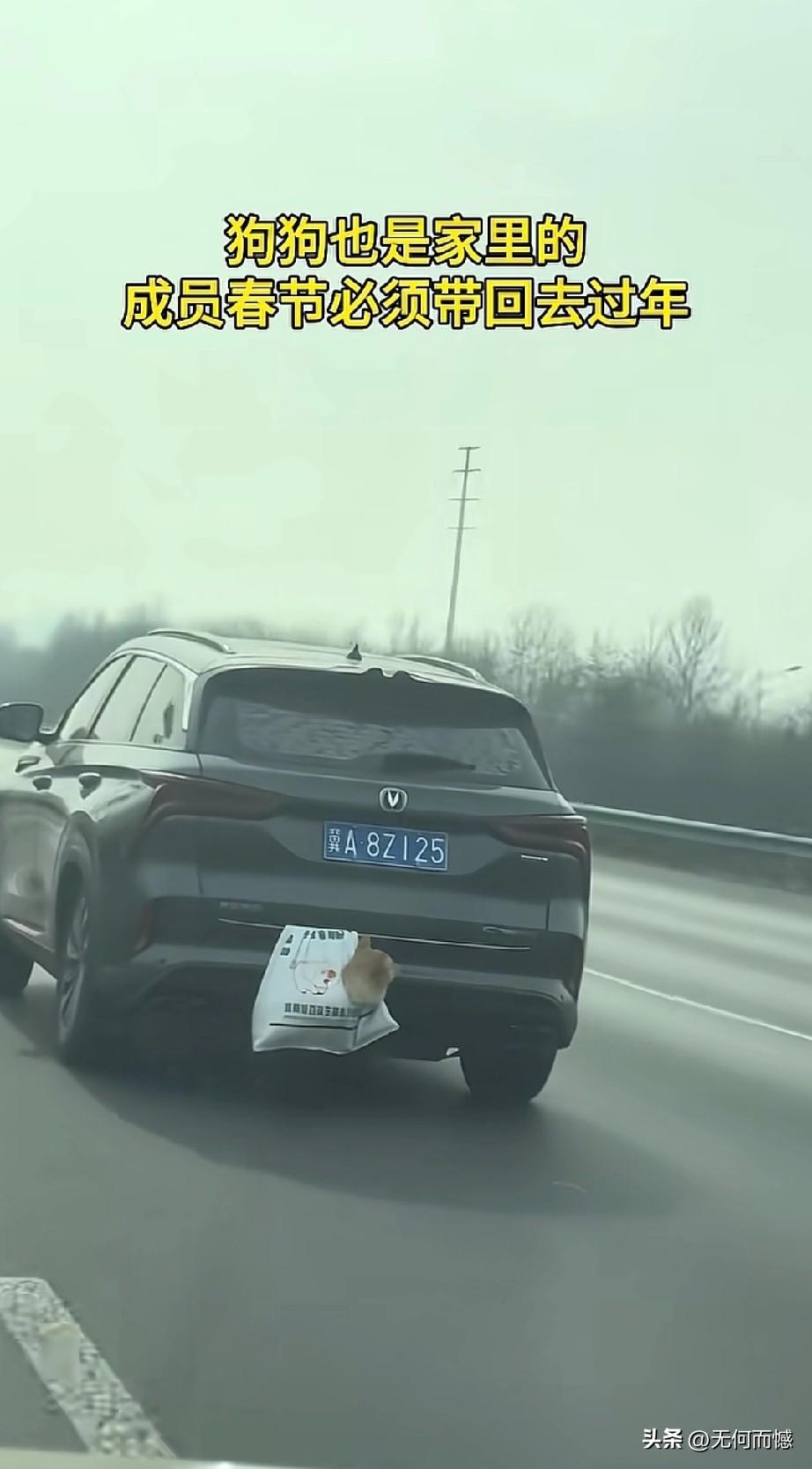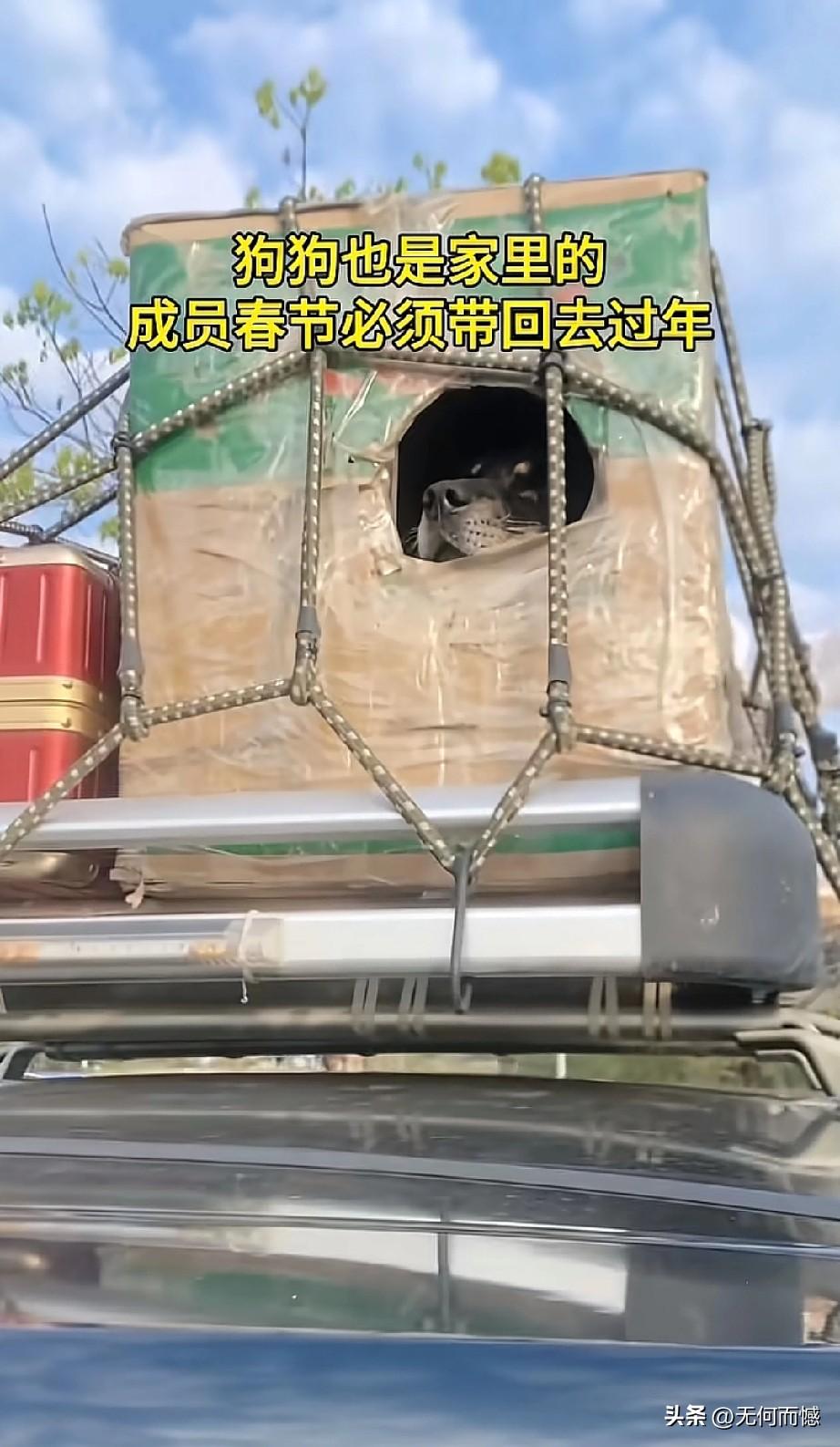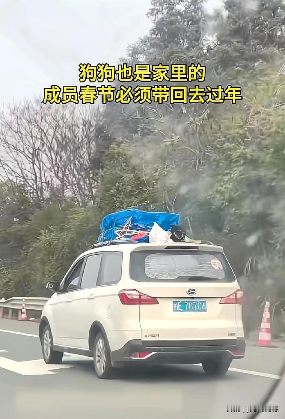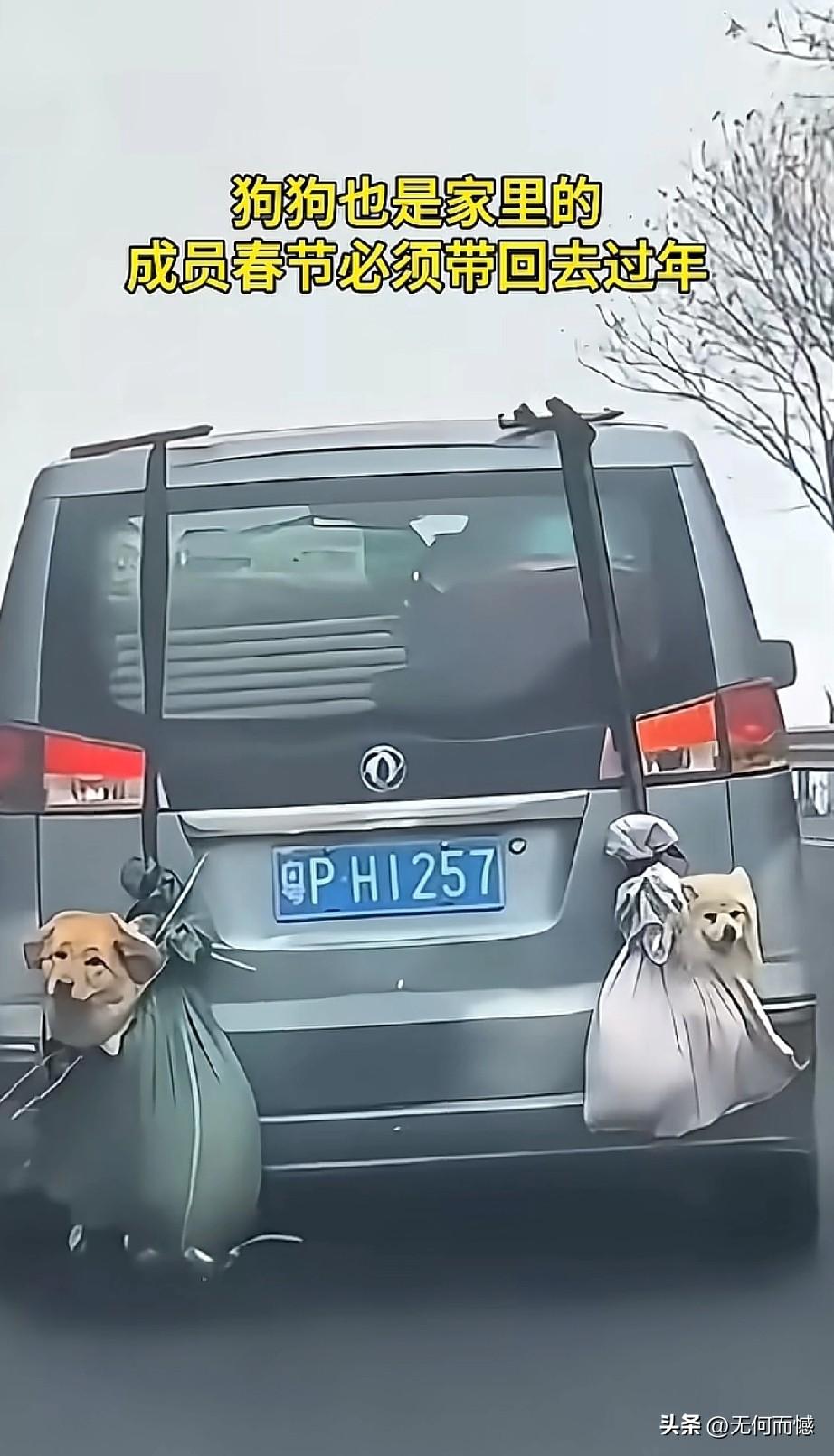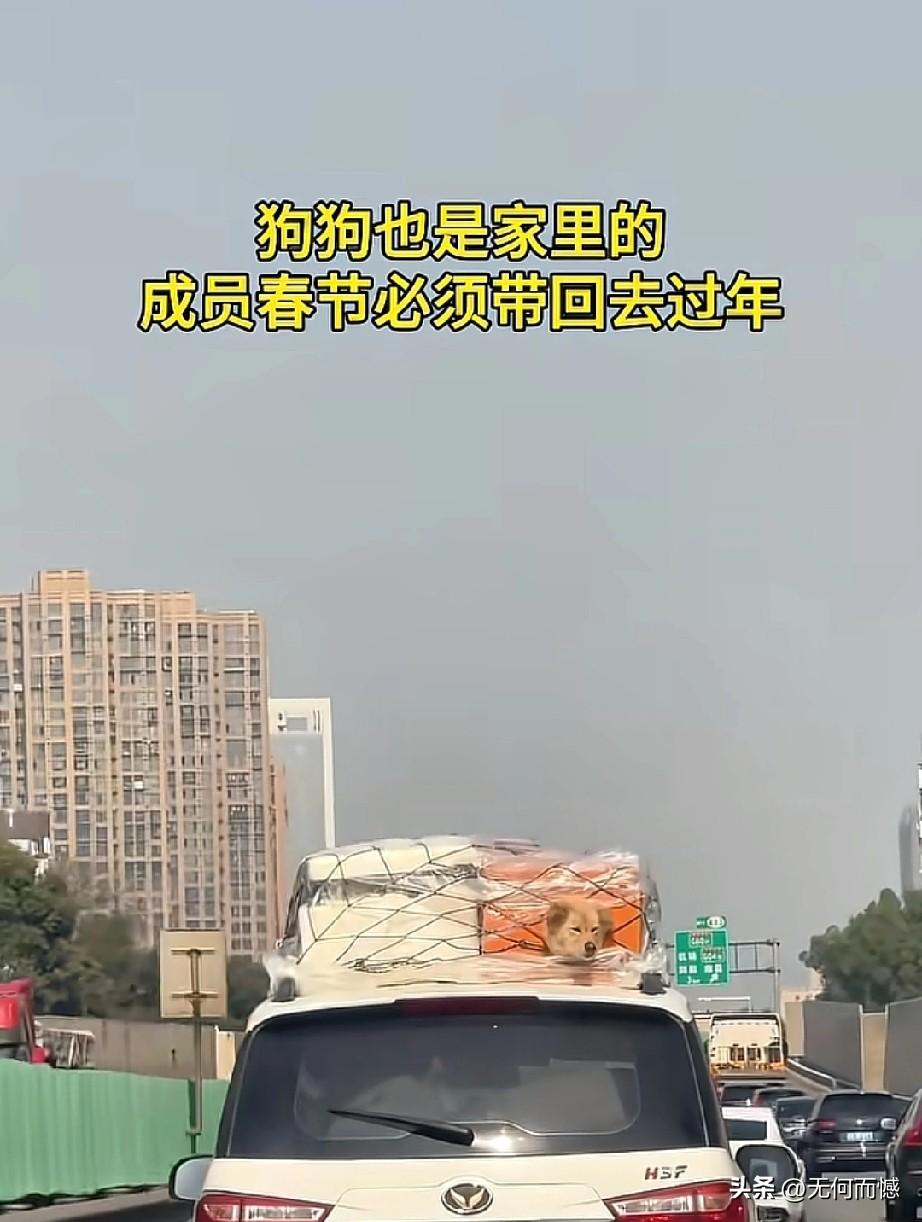 看到这些开车带着毛孩子回家过春节的人,让人非常的感动,感受到这些人是非常善良的,回家过春节,并没有扔下毛孩子不管,这才是合格的狗主人应该做出来的行为,尽管这些人没有把狗放在车里,有的挂在车外面,有的在放在车顶上,如果路途远、气温低的话,毛孩子不仅遭罪,而且也存在着安全隐患,考虑到车上也许已经坐满了人,这么做也是无可奈何之举,总比那些自己回家过春节,却把狗卖给狗肉馆、或是吃掉或是抛弃了的人要强百倍!