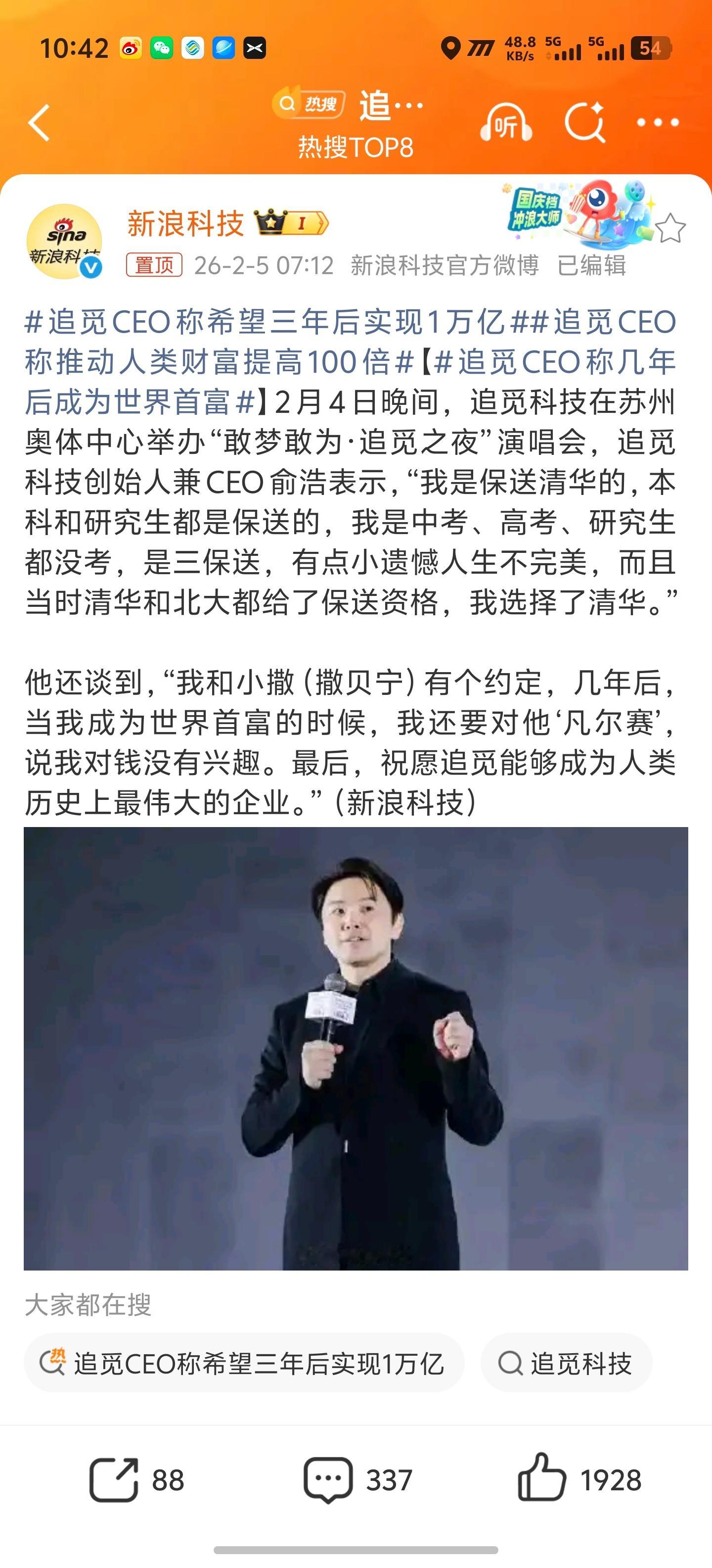 追觅ceo称几年后成为世界首富哈哈哈,他又来了,最近很多惊人言论上热搜,他其实是故意的。因为这样有巨大流量,然后很多人就知道追觅了。省了多少宣传费,昨晚的演唱会也是,请了很多博主都刷屏了,造势的。