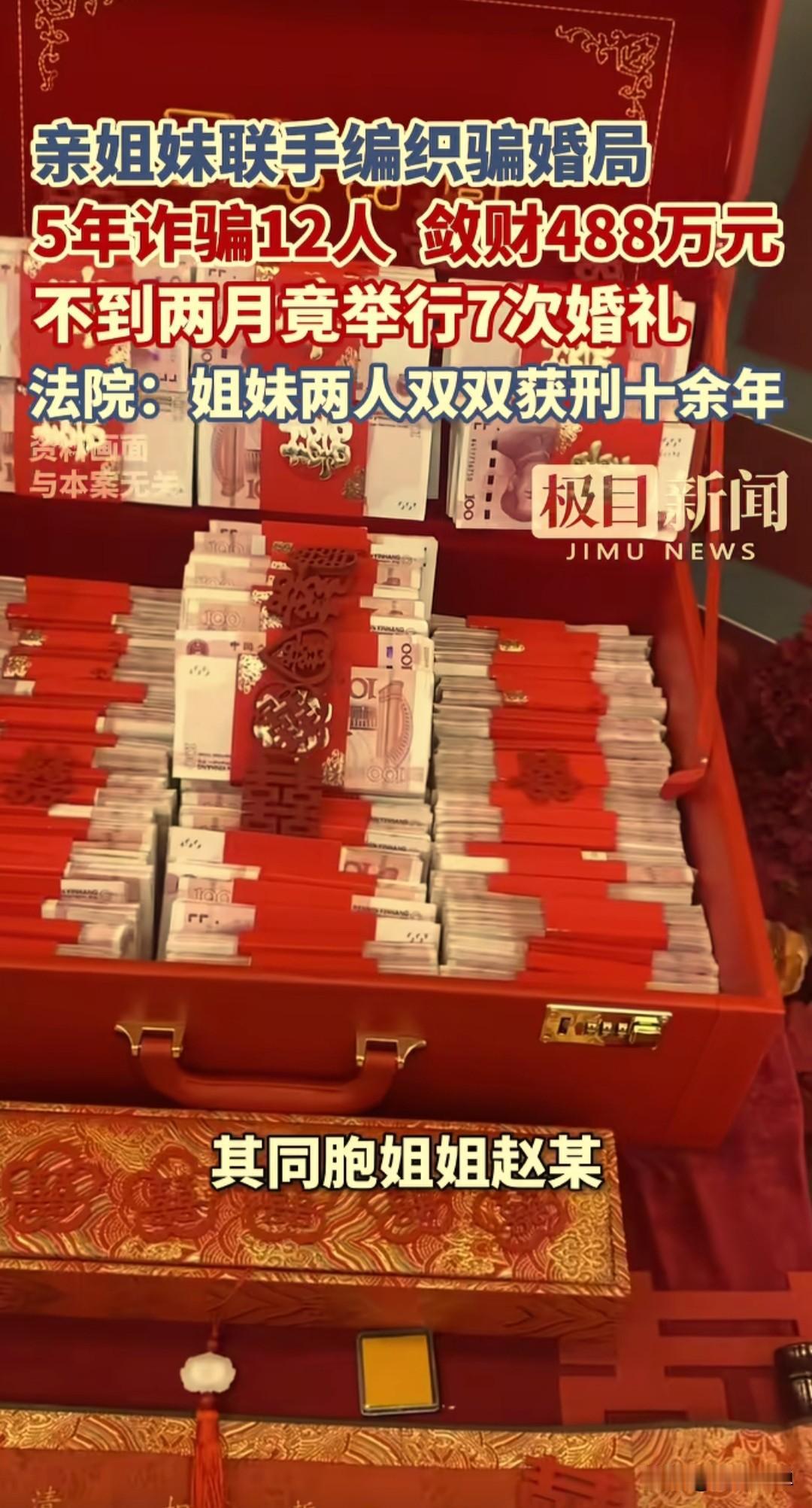 姐妹俩联手骗婚骗彩礼488万,1个半月办7次婚礼,专门坑单身老实人 这对姐妹花把结婚当成了“流水线作业”,她们隐瞒已婚事实,在短短1个半月内就办了7次婚礼,2020年到2025年,两人一共骗了12个家庭,敛财高达488万。 姐姐扮演“未来大姨姐”的角色,负责物色目标、谈彩礼。妹妹则扮演新娘,和受害者领证办酒。等彩礼一到手,两人就集体消失,换个地方继续行骗,两人分工明确,妹妹去相亲并索要彩礼,姐姐充当角色管理赃款。 妹妹冯某已婚事实,使用假名字,专门针对农村单身青年相亲,在建立关系后,以彩礼、三金、婚礼等名义索要大额钱财,要办理结婚登记的时候以各种理由拖延,要么工作忙,要么户口问题等。 在举办完婚礼,收到钱后,马上消失又更换下一个目标,姐姐赵某以娘家人的身份出面证明妹妹是单身,还负责接收和保管骗来的钱财,有问题出现时编造谎言来圆场。 更可恶的是,她们专挑那些家境普通、渴望结婚的老实人下手,用别人的血汗钱来满足自己的奢靡生活。 最终,两人因诈骗罪和重婚罪数罪并罚,得到了应有的惩罚,主犯冯某犯诈骗罪和重婚罪,被判有期徒刑十五年六个月,其姐姐赵某犯诈骗罪,被判有期徒刑十一年六个月。 婚姻骗婚 骗彩礼新陷阱 婚恋骗婚 假婚骗局 骗婚骗局 骗彩礼 骗婚女