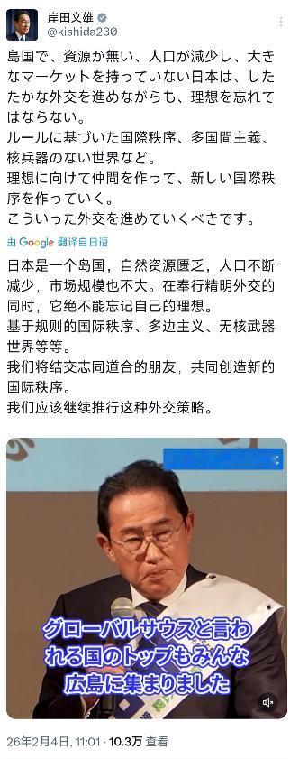 日本前首相岸田文雄今天(2月4日)发文写道:“日本是一个岛国,自然资源匮乏,人口不断减少,市场规模也不大。在奉行精明外交的同时,它绝不能忘记自己的理想。基于规则的国际秩序,多边主义,无核武器世界等等。我们将结交志同道合的朋友,共同创造新的国际秩序。我们应该继续推行这种外交策略。” 日本前首相岸田文雄在2月4日发表的文章中,开篇便点明了日本的现实困境:作为岛国,自然资源极度匮乏,石油、天然气、铁矿石等关键资源几乎全部依赖进口。 这种资源上的先天不足,使得日本在国际市场上的议价能力较弱,经济发展受到很大制约。与此同时,日本的人口结构也面临着严峻挑战。 自2008年总人口触顶后,日本已连续16年人口减少,2025年新生儿数量同比下降3.3%,65岁以上老年人口占比达29.58%,少子老龄化问题日益严重。 这不仅导致劳动力市场萎缩,还加重了社会保障负担,对经济的可持续发展构成了巨大威胁。此外,日本的市场规模相对较小,国内消费需求增长乏力,进一步限制了经济的增长空间。 在这种情况下,岸田文雄提出日本在奉行精明外交的同时,绝不能忘记自己的理想。基于规则的国际秩序、多边主义、无核武器世界等理念,是日本长期以来所倡导的价值观。 日本作为联合国安理会的重要成员,一直积极参与国际事务,致力于推动多边合作。 例如,日本在联合国维和行动中发挥了重要作用,派遣自卫队参与了多个国家的维和任务。同时,日本也在气候变化、环境保护等领域积极发声,推动全球合作应对挑战。 为了实现这些理想,日本需要结交志同道合的朋友,共同创造新的国际秩序。在这方面,日本与美国、澳大利亚、印度等国家建立了紧密的合作关系。 四方安全对话(Quad)就是一个重要的平台,通过这个机制,四国在安全、经济、技术等领域展开了广泛的合作。 例如,在关键矿产供应链方面,四国启动了“四方关键矿产倡议”,旨在减少对单一国家的依赖,确保供应链的安全与稳定。 此外,日本还与欧盟加强了经济安保合作,共同应对全球供应链碎片化和技术脱钩等挑战。 然而,日本的外交策略也面临着一些挑战和争议。在安全领域,日本近年来不断加强军备建设,计划购买进攻性武器,并试图突破“专守防卫”政策。 这引起了周边国家的担忧和警惕,也与日本所倡导的无核武器世界理念相矛盾。此外,日本在处理与周边国家的关系时,也存在一些问题。 例如,在历史问题上,日本的一些政客的不当言论和行为,伤害了亚洲邻国人民的感情,影响了地区的和平与稳定。 岸田文雄的这篇文章反映了日本在当前国际形势下的战略思考。日本面临着资源匮乏、人口减少、市场规模有限等现实问题,需要通过精明的外交策略来维护自身的利益和安全。 同时,日本也应该坚持自己的理想,推动多边主义和基于规则的国际秩序的建立。然而,日本在实现这些目标的过程中,需要妥善处理与周边国家的关系,避免采取可能引发地区紧张局势的行动。 只有这样,日本才能在国际社会中发挥更加积极的作用,为地区和世界的和平与繁荣做出贡献。