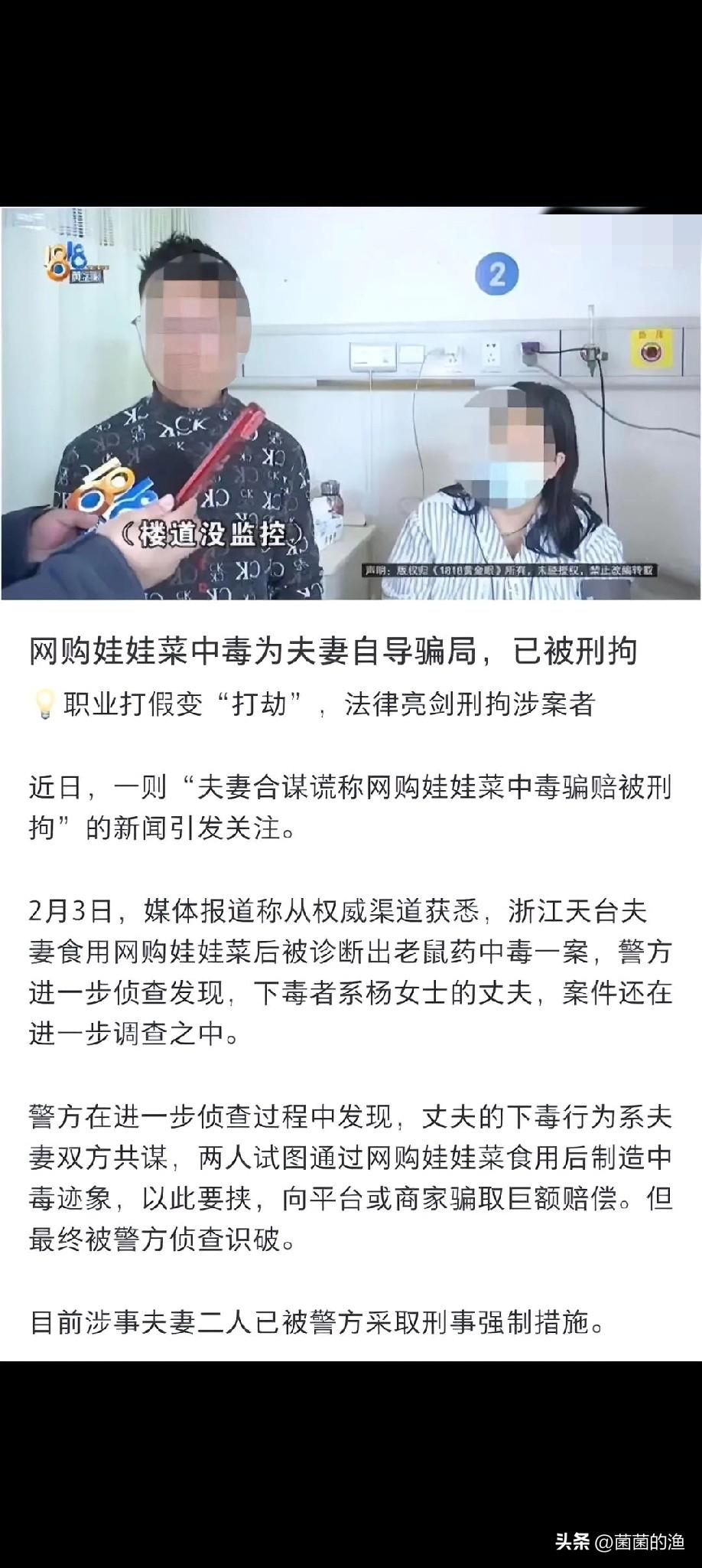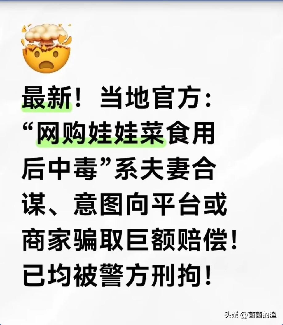 “一周前,全网都在狂喷那个商家,说人家是黑心奸商!一对夫妻说吃了网购的娃娃菜中毒倒地了,那家店直接被骂到注销跑路,人影都没了。大家气炸了,说食品安全太黑了,简直没法看。结果才两天,剧情突然大反转!警方出来说,包菜的报纸上那点鼠药,量小得根本毒不倒人。同一天,风向全变了,媒体爆出来是丈夫陈某波自己可能投的毒,大家又开始猜是不是家里出了啥幺蛾子。可才过半天,又双叒叕反转了!最后实锤了:这出戏就是夫妻俩自导自演的!他们自己早就在网上买了‘溴鼠灵’,然后把毒药拌进娃娃菜里,自己吃下去,就为了假装食物中毒,好找平台商家要赔偿。检测报告显示得明明白白,毒就是他们自己下的!现在两人因为诈骗被刑拘了。 以前有‘夫妻肺片’这样的老字号传了百年,现在倒好,出个‘夫妻毒菜’,直接成了大笑话!为了几个赔偿款,连命都不要了?真是人心比鼠药还毒啊!这世上缺钱的多了去了,但缺心眼到这份上的可真少见。”