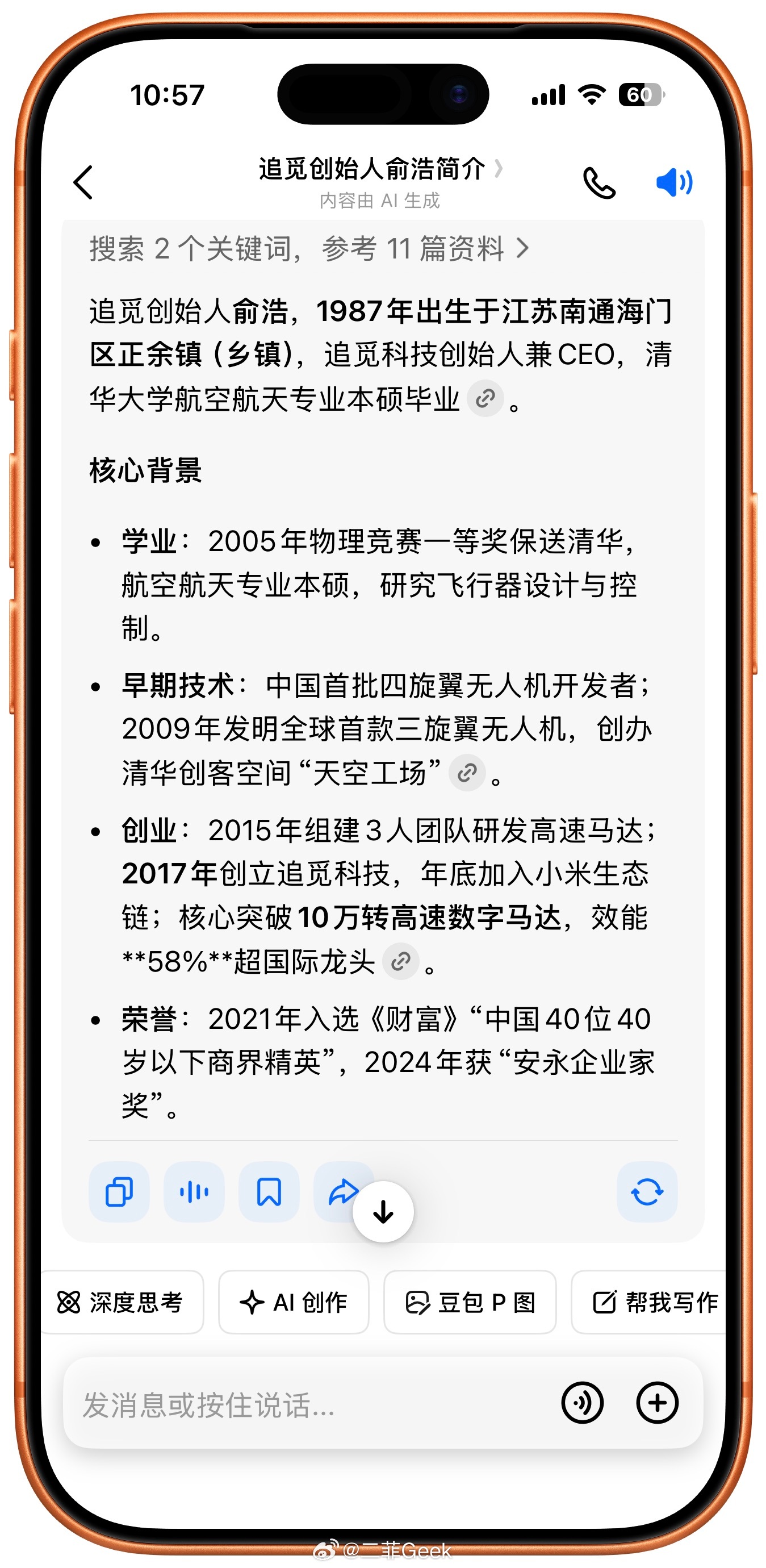 看一下追觅科技创始人兼CEO俞浩的个人简介可以说是最顶尖的小镇做题家了本科研究生都是直接保送清华天赋和努力他都占了祝他成功吧(认真脸