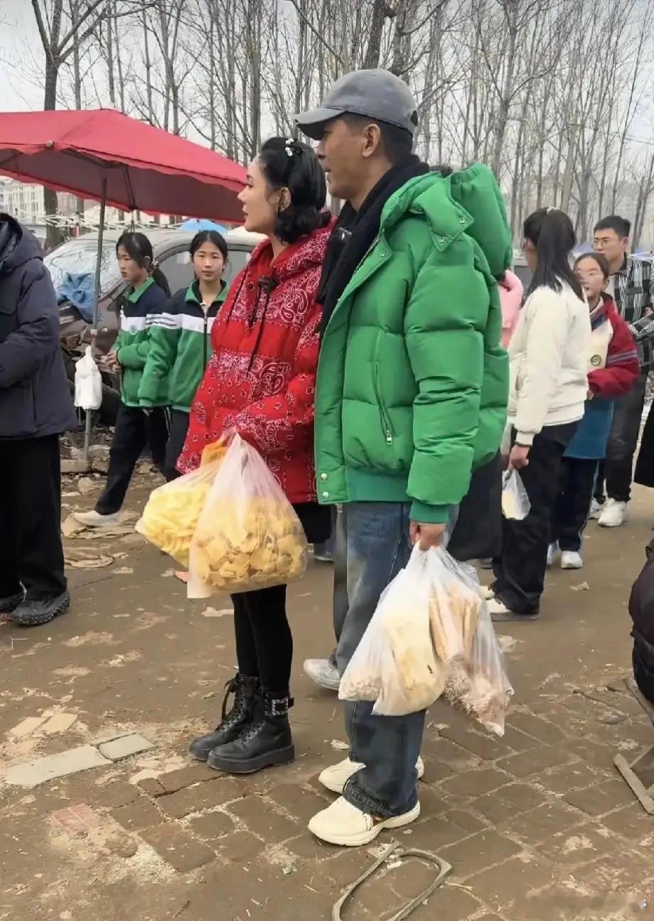 郭晓东带老婆程莉莎回山东老家过春节,夫妻俩一大早赶大集买年货,穿衣打扮朴素,脸上没有浓妆艳抹,完全融入了村民里面,非常接地气!