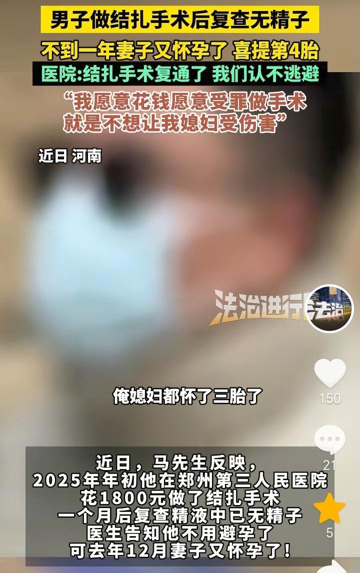 男子结扎后媳妇怀孕了?河南,男子做了结扎手术,几个月后妻子确是怀孕了,迎来了第四胎。 原来男子在2025年年初,在郑州第三人民医院花1800元做了结扎手术,一个月后复查精液中已无精子,医生告知他不用在避孕,可是去年12月妻子又怀孕了,喜提第四胎,男子觉得无法接受,自己愿意去花钱做结扎手术,不仅花钱还受罪,目的就是不想让媳妇在受伤害。医院对此回应,结扎手术复通了愿意协商赔偿。目前男子家人决定留下这个孩子。 不想让媳妇在受伤,宁愿自己去结扎花钱受罪,可见男子也是非常的心疼媳妇,能嫁给这样的老公,他媳妇肯定也是非常的幸福。 让人没想到的是做了结扎,罪也受了,结果媳妇还是怀孕了,那么就等于钱白花了,罪也白受了,不过归其原因还是在于医院,是医院对手术结果太过肯定,通常男性结扎后确实也有复通情况的存在,不过也是极少数。 这样极少数的情况都被男子遇到,那就说明孩子是上天赐予的,不如就顺其自然生下来,毕竟这也是一条小生命。