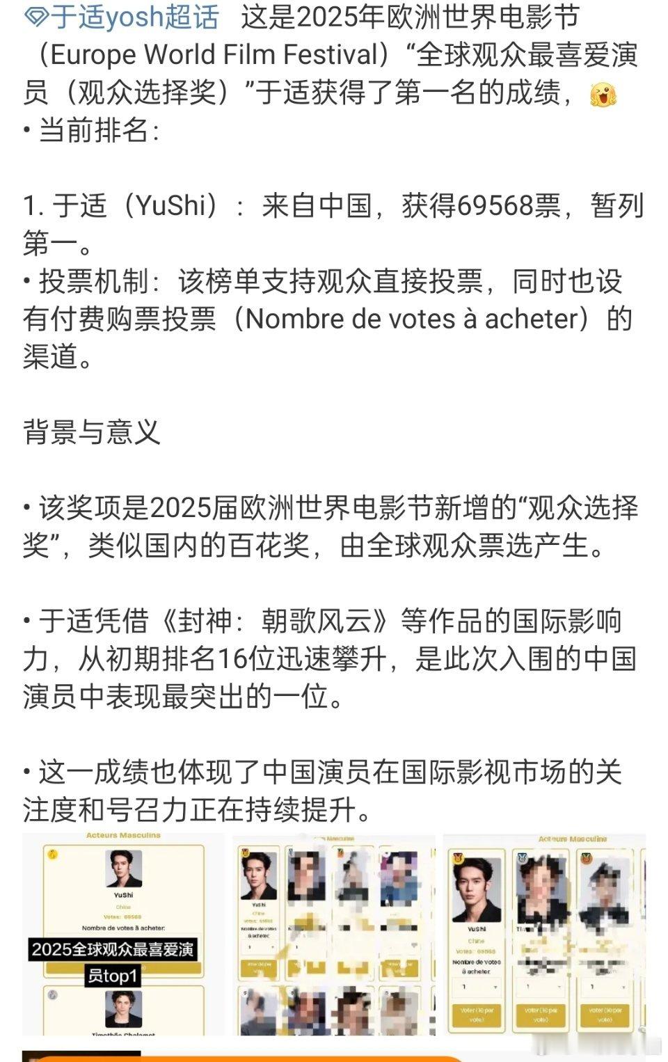 于适 获得2025年欧洲世界电影节(Europe World Film Festival)“全球观众最喜爱演员(观众选择奖)”第一名!!