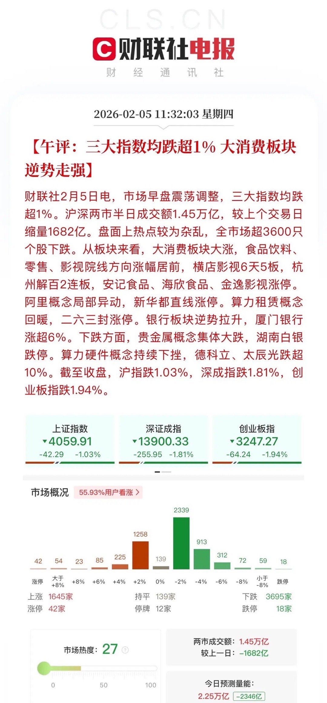午评,调整缩量行情走势健康!不要东张西望,行情没有任何问题的。白酒冲高回落,贵州茅台18%的反弹幅度,打出了城门立木的气势,别扯什么龙头是皇台酒业,你买进去吃得到吗?心里有底吗?所以这种无效的大白话以后少说,哪有三千一开始就给你抓出来山西汾酒、贵州茅台、酒鬼酒、舍得酒业强的呀…反正我说15%修复言出法随,而且目前的趋势看可能直逼28%-30%这一档!那么三千看猪肉修复15%能成行吗?酱油三千的千禾味业大的明牌呀,作业抄对了吗?别看两市超5000家公司,但是即便现在是牛市能出手的公司也才10%哟。剩下的除了炒、过山车、黄粱一梦没有别的!记住牛市中后期三大主线:科技(Ai应用、商业航天)、电池、消费医药。…