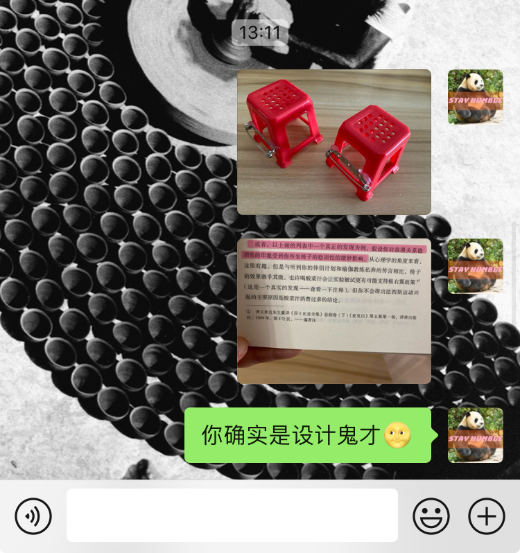之前友友送我的塑料凳胸针,今天在书里读到这段才发现她确实是个设计鬼才