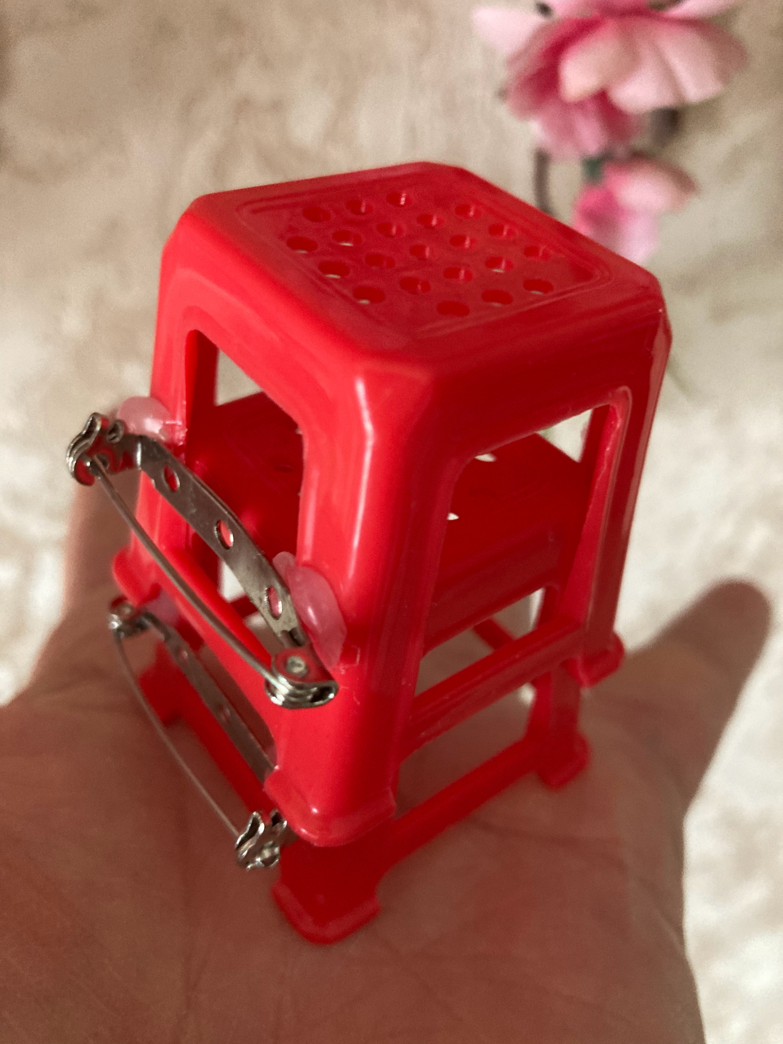 她说某天与朋友吵架后,走到车站等公交,身心俱疲,发现站台边有只塑料凳,如获至宝,坐上去才发现塑料已经老化,摇摇晃晃很不牢靠,于是触发她对人际关系的思考,后来设计了这个形状的胸针……