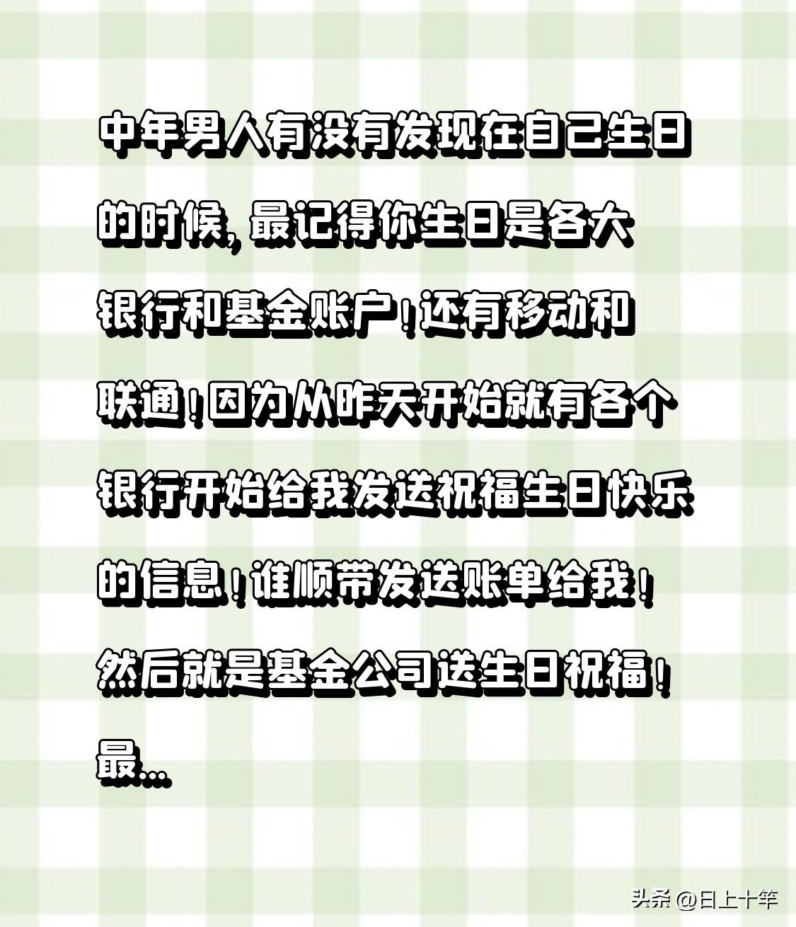 中年男人有没有发现在自己生日的时候, 最记得你生日是各大银行和基金账户!还有移动和联通! 因为从昨天开始就有各个银行开始给我发送祝福生日快乐的信息!谁顺带发送账单给我! 然后就是基金公司送生日祝福! 最后是移动和联动,还有电信都发来贺信! 反而是自己的家人一点反应都没有[捂脸]
