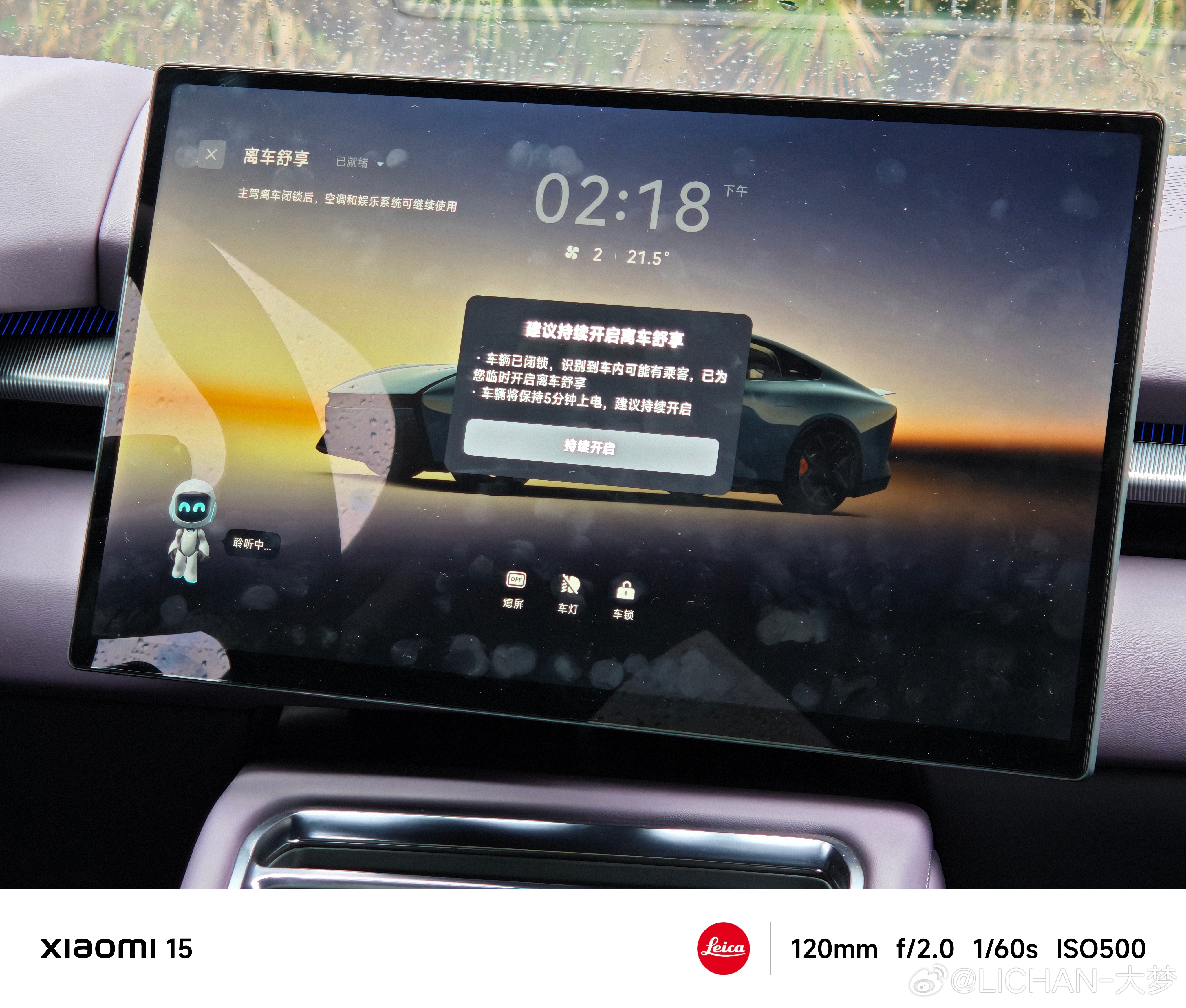 这功能真的还满贴心的因为下雨了,所以他们在拍车的时候我就在车后排坐着大梦把手机拿走之后就自动锁车了,这个时候小P识别到我还在后排,就会自动开启离车舒享我后排的座椅加热、空调等功能都能持续使用,就真的很照顾后排!