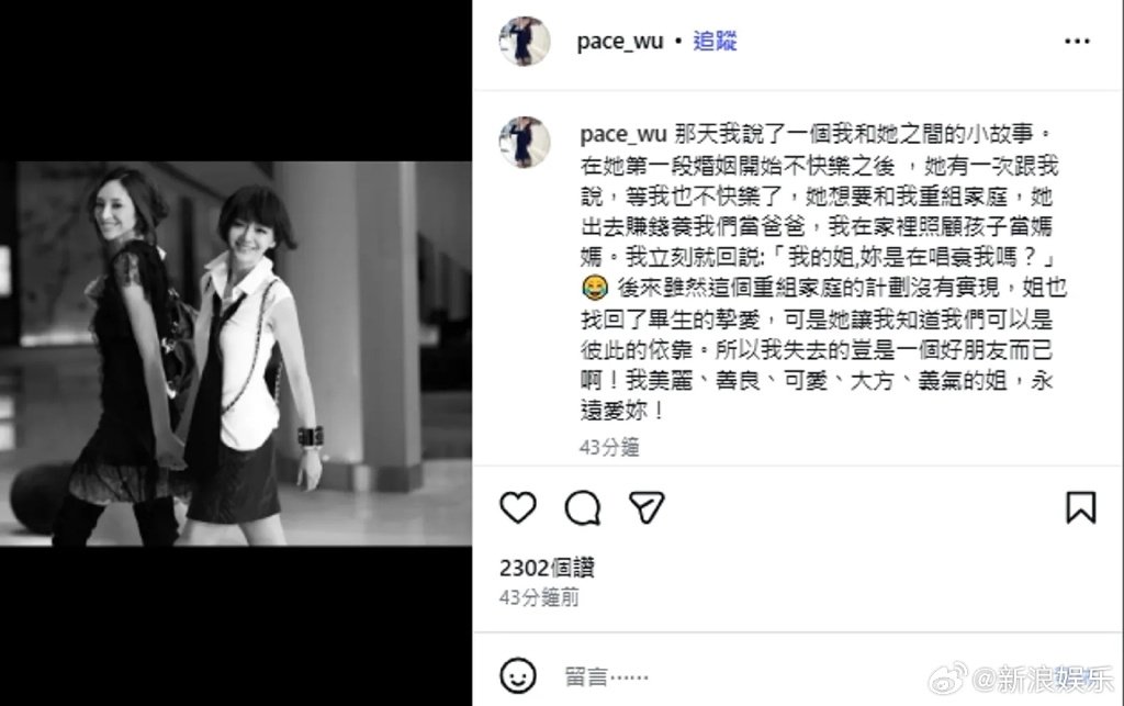 吴佩慈发文怀念大S大S曾说会赚钱养吴佩慈 2月4日晚,吴佩慈发文怀念大S,她透露在大S的第一段婚姻不快乐后,大S曾说如果吴佩慈也不快乐了,想和她重组家庭,自己出去赚钱照顾她和孩子们。吴佩慈感慨虽然计划没有实现,但“她让我知道我们可以是彼此的依靠”,“我失去的岂是一个好朋友而已!”