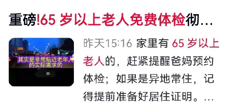 家人们,好消息来了!国家升级65岁以上老人免费体检,明年起全新落地! 过去体检“一刀切”,项目雷同、流程赶、报告看不懂。现在大变样——先为每位老人绘制专属健康风险“画像”。医生提前了解慢病史、生活习惯,再定制检查,比如常吸烟的查肺,血糖不稳的加强糖筛。 还有两项关键项目免费做:一是低辐射DR胸片,筛查肺结节、感染等;二是糖化血红蛋白检测,不空腹,反映近3个月血糖水平,及时发现隐性糖尿病。 覆盖面也扩大了!在当地住满半年的65岁以上老人,不限户籍,每年都可免费参加。各社区正优化服务,推行预约制,并安排报告解读。 子女们记得提醒爸妈预约,帮忙整理病史、说明生活习惯。国家送上精准健康礼包,咱们一起帮老人接住这份福利! 对此你怎么看? 中年人体检