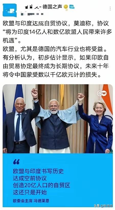 “印度与欧盟达成经贸协议,会造成中国损失惨重。”这是外媒德国之声的带节奏歪曲解读。 印度与欧盟达成经贸协议,表面上看中国会受影响。但仔细分析,供应链都在中国手上,印度和欧盟凭什么能离得开中国的供应链。再者印度的基础设施一地鸡毛,连最基本的电力都不能满足本国工业需要,哪来的自信可以短时间与中国竞争。 客观的说,印欧联盟,对中国当然会有些影响,但印度和欧盟达成经贸协议更多的是被特朗普逼出来的抱团取暖相互安慰而已,因为印度和欧盟短期内谁也离不开中国。 新锐领航权益升级