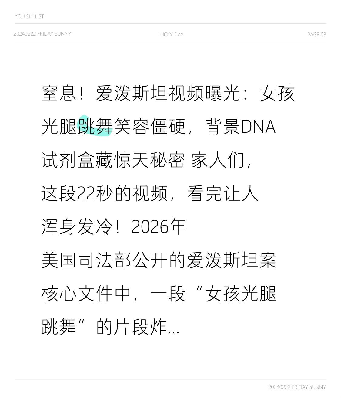 窒息!爱泼斯坦视频曝光:女孩光腿跳舞笑容僵硬,背景DNA试剂盒藏惊天秘密 家人们,这段22秒的视频,看完让人浑身发冷!2026年美国司法部公开的爱泼斯坦案核心文件中,一段“女孩光腿跳舞”的片段炸穿全网——棕榈滩豪宅的房间里,未成年女孩穿着单薄衣物光腿起舞,肢体僵硬如提线木偶,勉强扯出的笑容里满是恐惧,而背景中不仅有陌生男子的哄笑声,桌上竟赫然摆着DNA亲子鉴定试剂盒,这哪里是跳舞,分明是权贵掌控下的绝望表演! 谁能想到,这场看似普通的“派对娱乐”,背后藏着跨越20年的罪恶网络。视频出自FBI2019年搜出的170部私密硬盘,被藏在爱泼斯坦书房的定制暗格里,拍摄时间跨度从1996年到2018年,覆盖纽约豪宅、萝莉岛等多个罪恶据点。画面中光腿跳舞的女孩未满18岁,是被“明星梦”“高薪工作”诱骗而来的受害者,她全程眼神躲闪,双手下意识攥紧衣角,每一个动作都透着被迫的抗拒,而爱泼斯坦站在一旁神态轻佻,指尖频繁逼近女孩,这场舞蹈实则是精神操控的前奏。 更细思极恐的是视频背景里的DNA试剂盒!网友放大画面后发现,桌上的试剂盒包装清晰可见,结合爱泼斯坦曾计划建“婴儿工厂”的疯狂构想,网友推测这可能是在为“优质基因筛选”留证,或是掩盖人口贩卖的证据。而另一段同步曝光的贴身共舞视频中,爱泼斯坦与女孩肢体紧贴,女孩全程紧绷,连呼吸都小心翼翼,对比之下更显这场“狂欢”的残酷——这些女孩不是舞者,而是被当作商品炫耀、被肆意践踏的猎物。 案件的转折点,藏在300万页公开文件里。随着《爱泼斯坦档案透明法案》生效,特朗普、克林顿、英国安德鲁王子等150余名政商名流的名字被曝光,美国商务部长卢特尼克曾谎称与爱泼斯坦划清界限,却被文件证实携妻前往萝莉岛聚餐;前白宫战略师班农在爱泼斯坦死前数月仍与其频繁联系,商议为其洗白。可就在真相即将大白时,关键证人弗吉尼娅2025年离奇自杀,爱泼斯坦2019年狱中“自杀”更是疑点重重——监控失效、狱警离岗、尸检显示颈部勒痕异常,分明是一场精心策划的灭口。 更让人愤怒的是,这170部视频仅公开少量片段,大部分仍被加密,文件中大量关键信息被涂黑,82页的卷宗仅公开1页,4500份提及特朗普的文件中,诸多指控被轻易否定。那些光腿跳舞的女孩,有的一辈子活在创伤中,有的至今下落不明,而施暴的权贵们,多数仍逍遥法外,甚至继续活跃在权力中心。 这段22秒的视频,从来不是简单的八卦,而是权力凌驾于法律的铁证。女孩僵硬的笑容里,藏着底层弱者的绝望;背景里的DNA试剂盒,暴露了权贵的贪婪与疯狂;被涂黑的文件背后,是无数受害者未被偿还的公道。爱泼斯坦虽死,但他背后的罪恶网络不该被遗忘,那些被践踏的尊严、被摧毁的人生,都值得一个真相。 你如何看待视频中隐藏的细节?你认为还有多少未被曝光的黑幕?评论区聊聊你的看法,点赞转发让更多人关注这场正义之战,不让受害者的眼泪白流!
