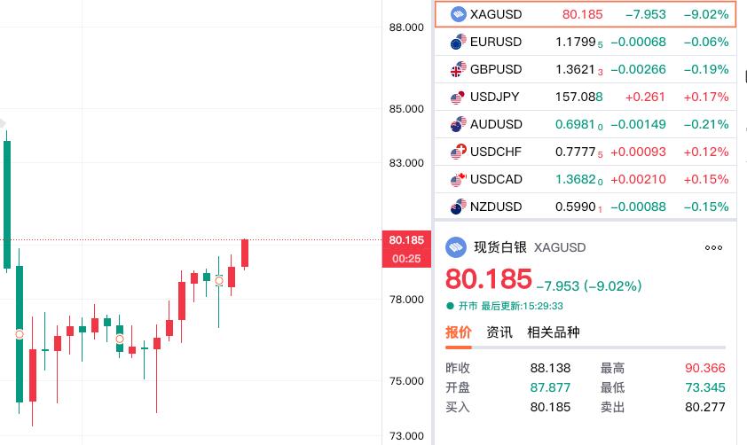 快讯,快讯! 白银价格重回80美元上方。 虽然今日盘中现货 白银价格再度大幅暴跌, 最低跌至73.345美元, 较昨日的收盘价下跌近十五美元, 市场唉声一片。 不过下午再度反弹企稳, 现在报价80.185美元, 较上一日交易日下跌7.953美金。 对于白银价格, 期货小褚还是认为 白银仍有反弹上攻90美元的可能性!
