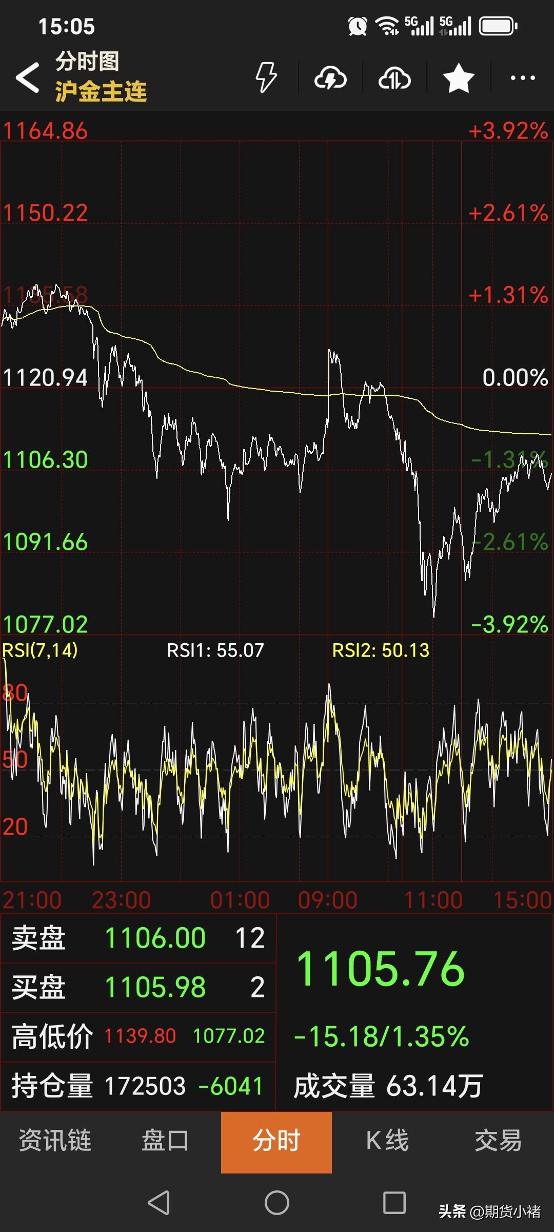 周四, 国内黄金期货 高开低走,偏弱运行! 主力合约收盘于1105.76元, 较上一日下跌15.18元。 对于黄金期货, 虽然再度回落, 但是期货小褚认为 下方存在较强支撑, 短期存在反弹上涨动能, 继续关注1160压力!