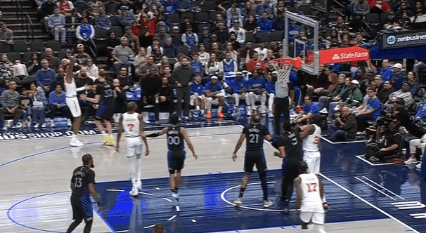 P2卡佩拉面对独行侠双塔篮下一抢二掠夺到前场篮板,随即在炸球调整后顶开加福德起身补篮。浓眉“黄雀在后”起跳后高举长臂结实按下卡佩拉的双手补扣。