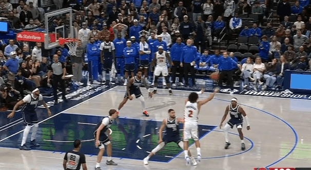 P1卡佩拉高位拿球策应,伊森无球起手发动“Middle Zoom”接球后顺势启动突破冲击篮下,浓眉执行沉退策略回退篮下镇守禁区,被伊森抢出身位优势,但随后预判到其起跳时机高高跃起伸出长臂完成追身钉板大帽。
